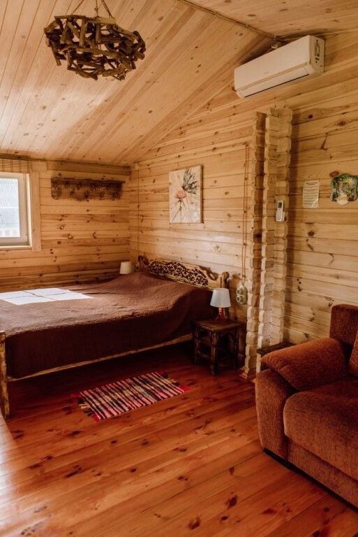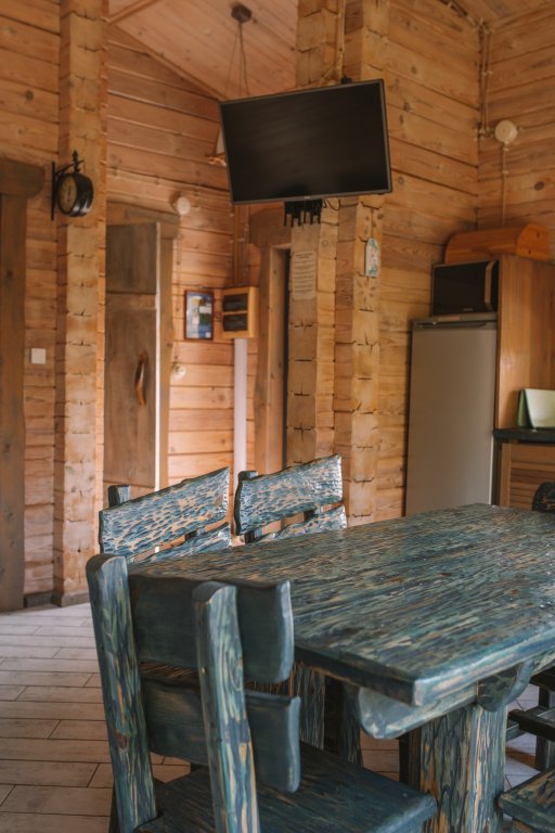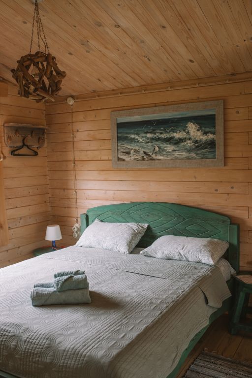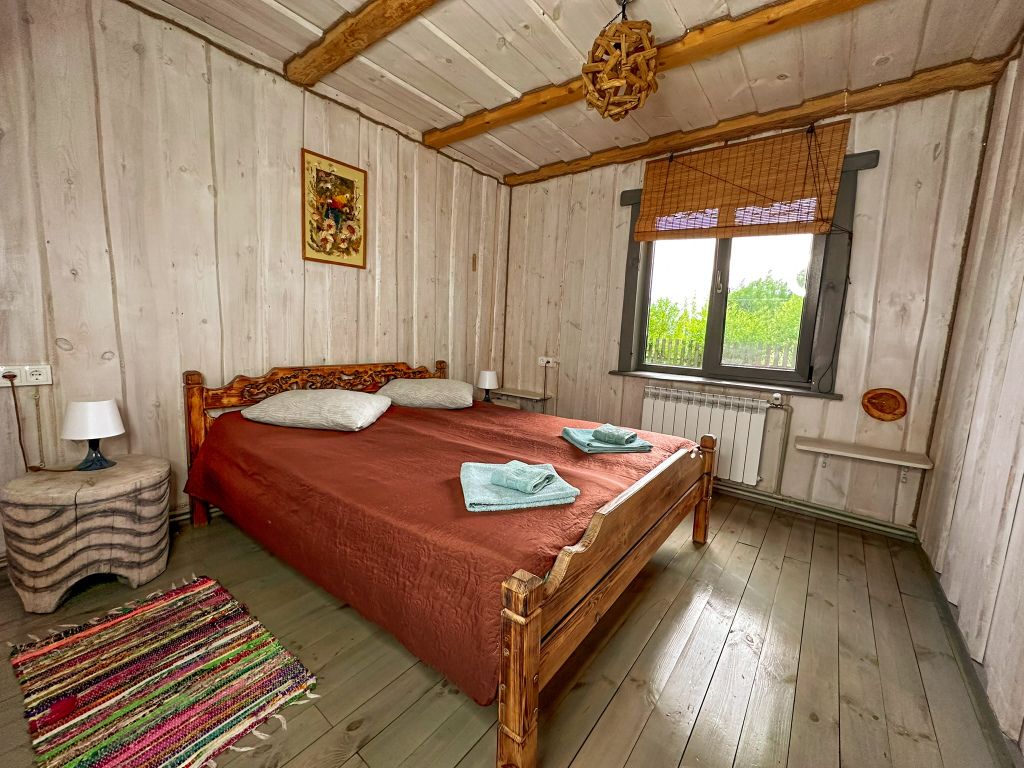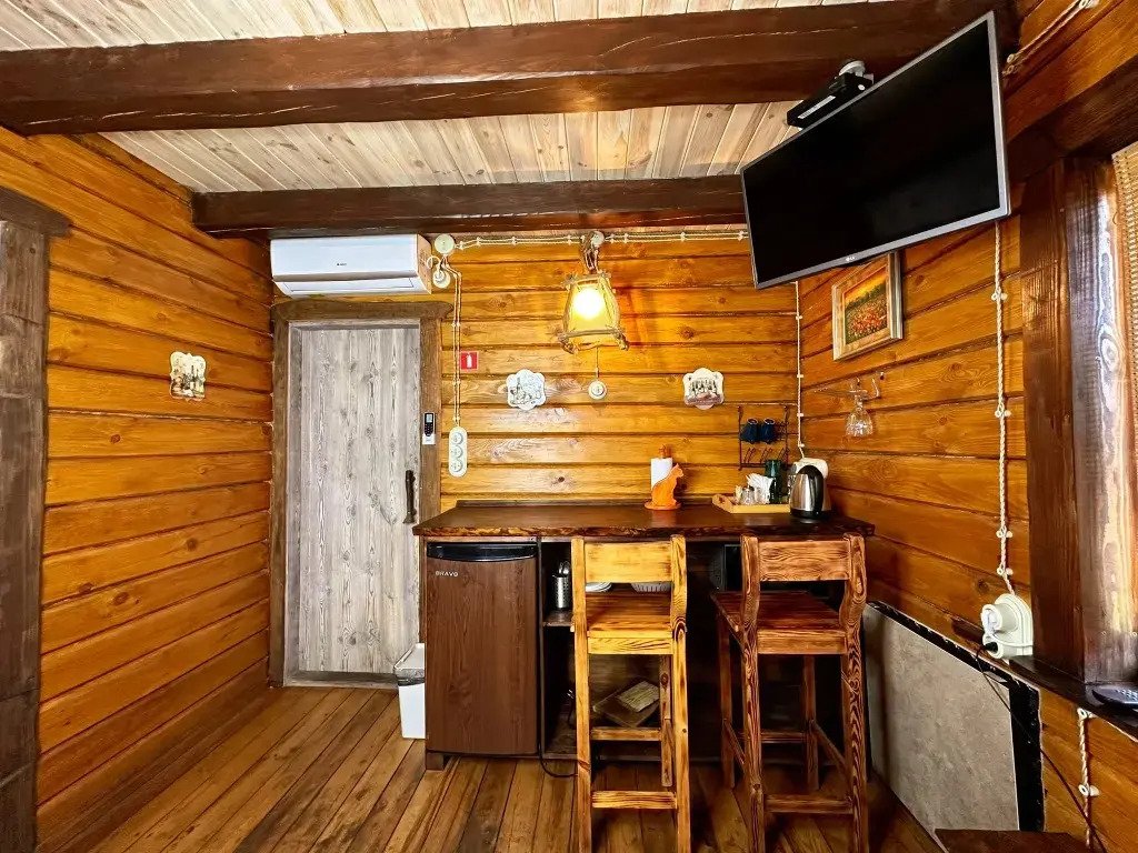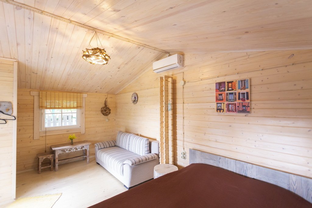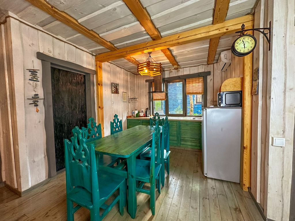 Для максимально комфортного отдыха есть все необходимое: кухонная зона (чайник, холодильник, микроволновая печь, набор посуды), двухместный диван в гостиной, мебель ручной работы, балкон с деревянными креслами, кондиционеры, беседка с мангалом для приготовления барбекю.
