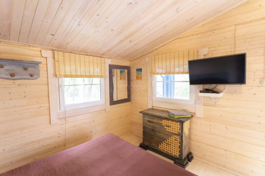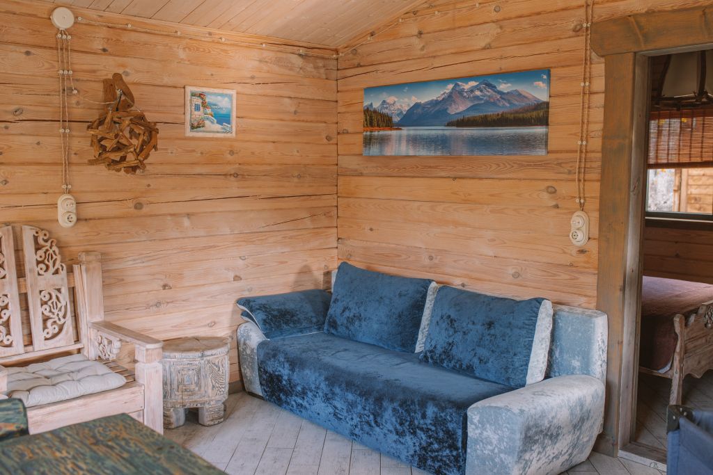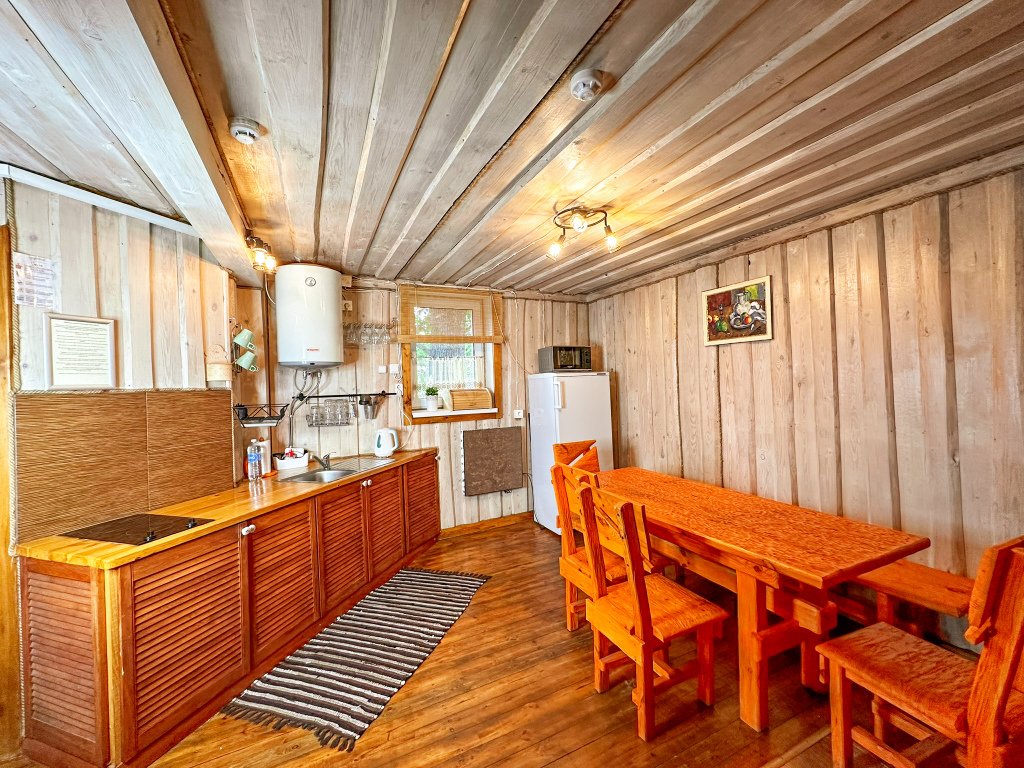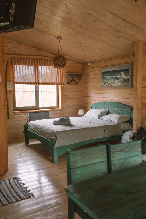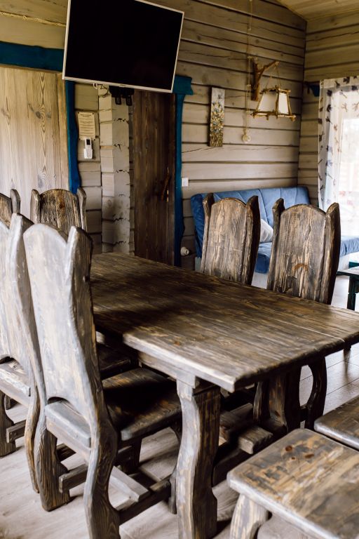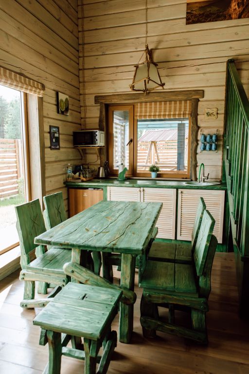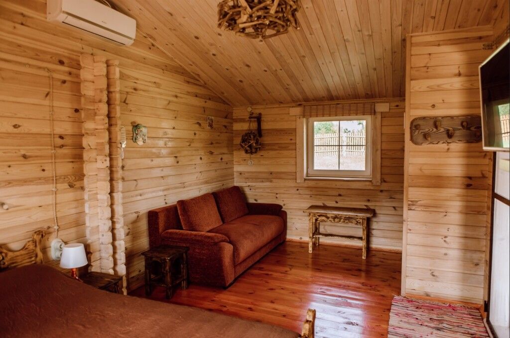 Для максимально комфортного отдыха есть все необходимое: кухонная зона (чайник, холодильник, микроволновая печь, набор посуды), двухместный диван в гостиной, мебель ручной работы, балкон с деревянными креслами, кондиционеры, беседка с мангалом для приготовления барбекю.