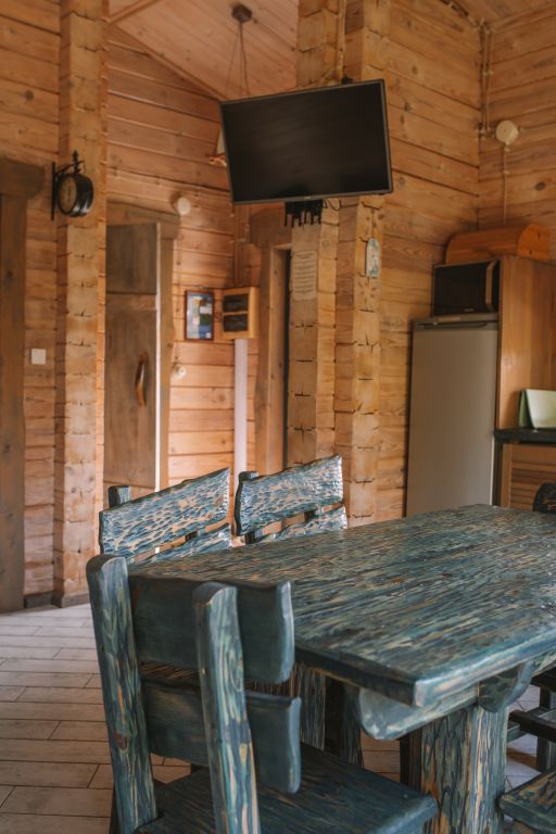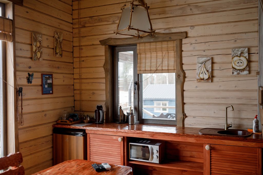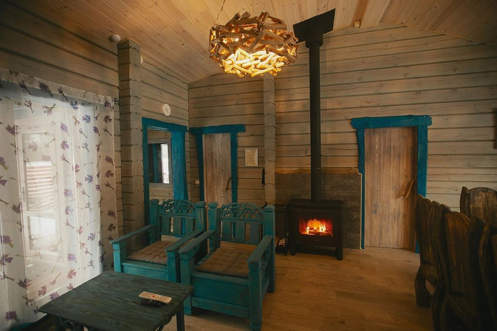 Для максимально комфортного отдыха есть все необходимое: кухонная зона (чайник, холодильник, микроволновая печь, набор посуды), двухместный диван в гостиной, мебель ручной работы, камин, панорамные окна, кондиционеры, терраса с мангалом для приготовления барбекю.
