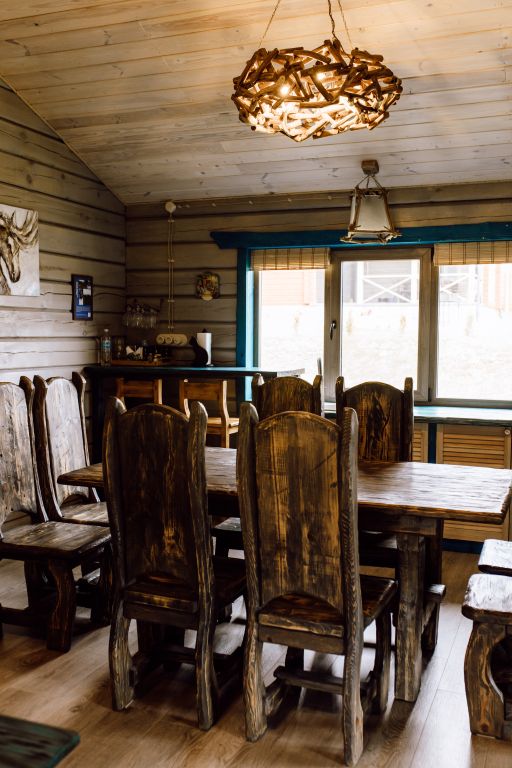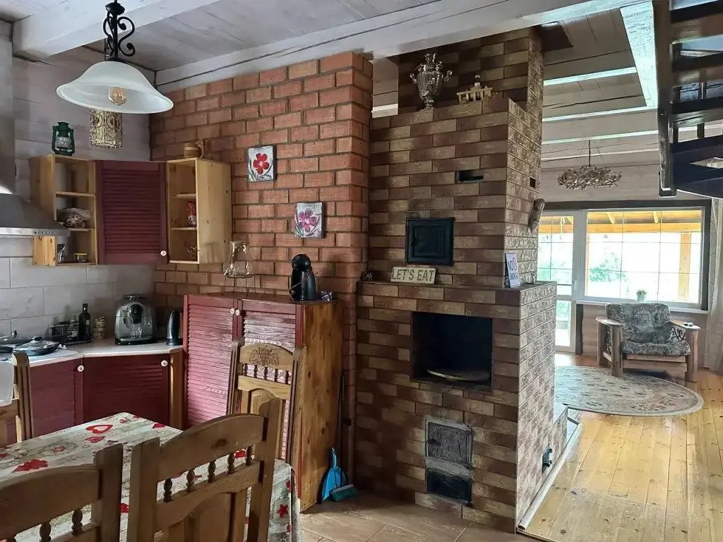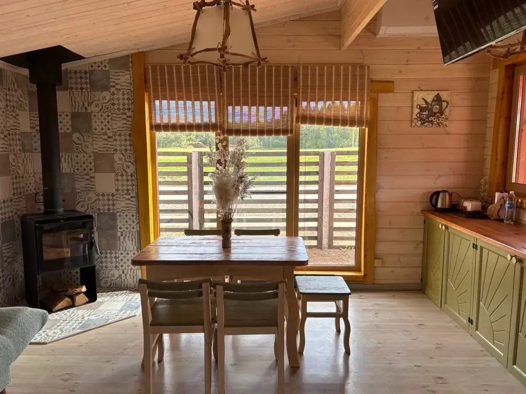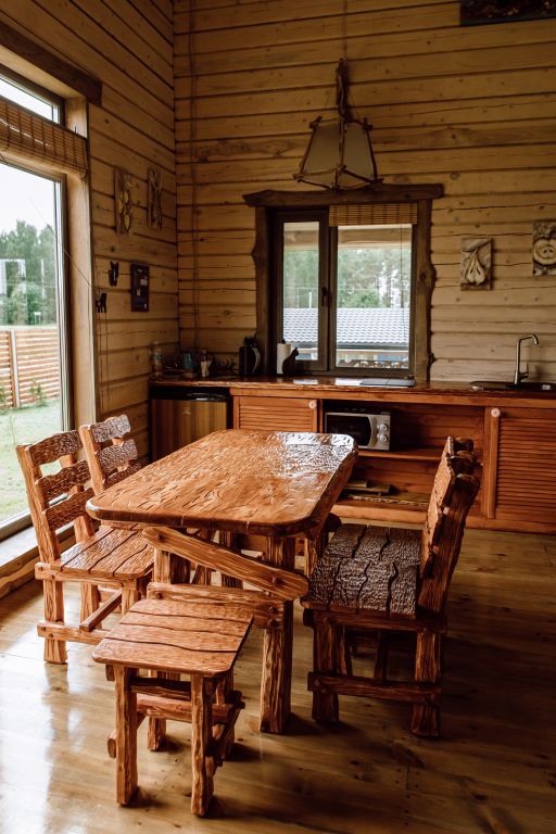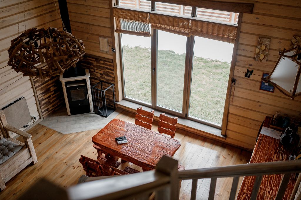Для максимально комфортного отдыха есть все необходимое: кухонная зона (чайник, холодильник, микроволновая печь, набор посуды), двухместный диван в гостиной, мебель ручной работы, камин, панорамные окна, кондиционеры, 2 террасы, одна из которых с мангалом для приготовления барбекю, качели.