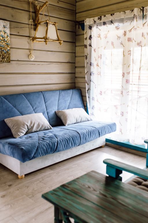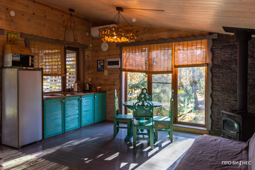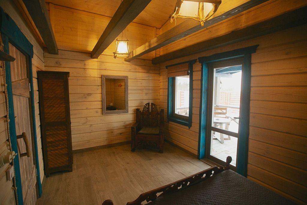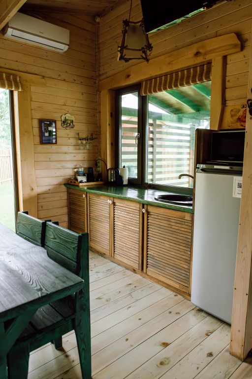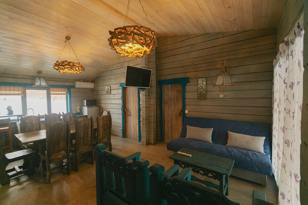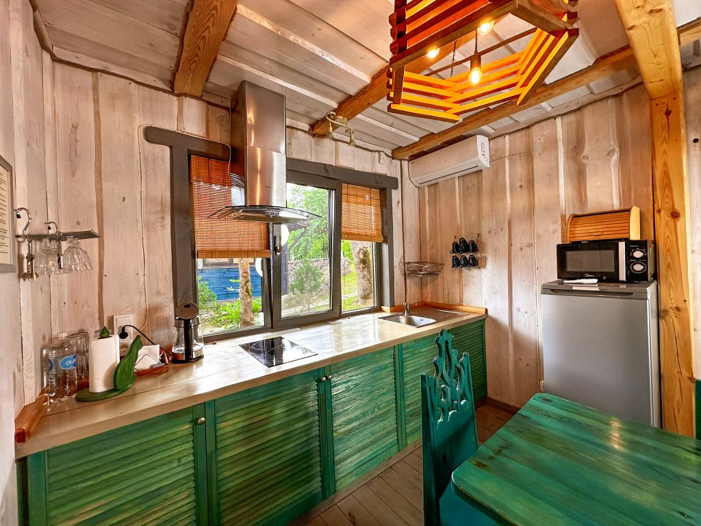 Для максимально комфортного отдыха есть все необходимое: кухонная зона (плита, чайник, холодильник, микроволновая печь, набор посуды), двухместный диван в гостиной, мебель ручной работы, панорамные окна, кондиционеры, терраса с мангалом для приготовления барбекю.