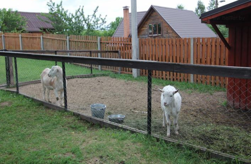 Мини-зоопарк с кроликами, гусями, козами и собаками.