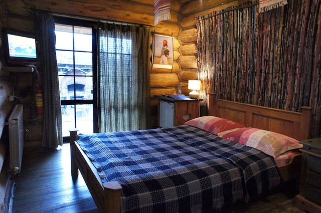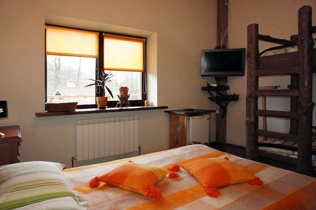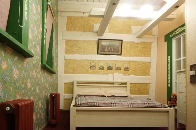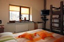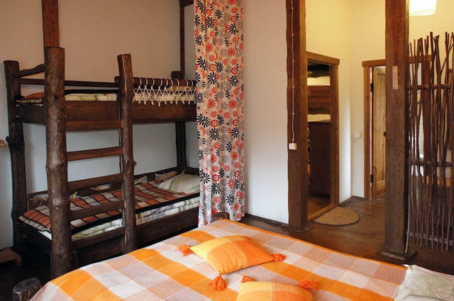 На втором этаже есть семейные апартаменты с большой двуспальной кроватью и двухэтажной кроватью для детей. Эта комната самая большая и светлая. В такой комнате удобно расположиться на ночлег и большой компанией.
