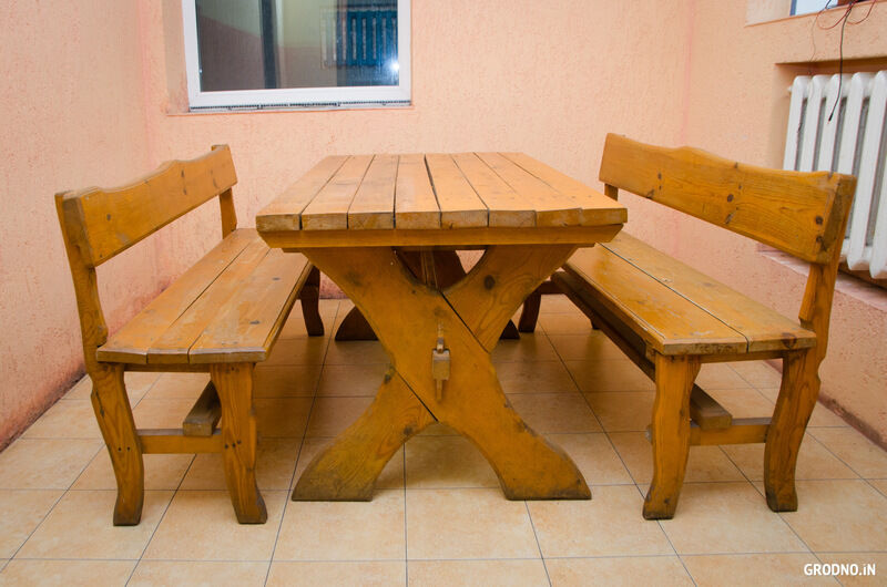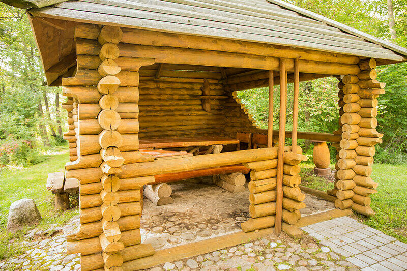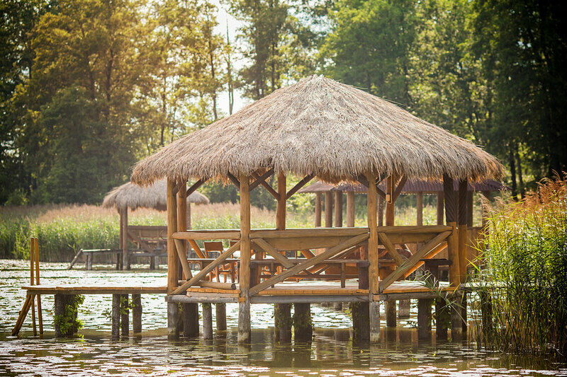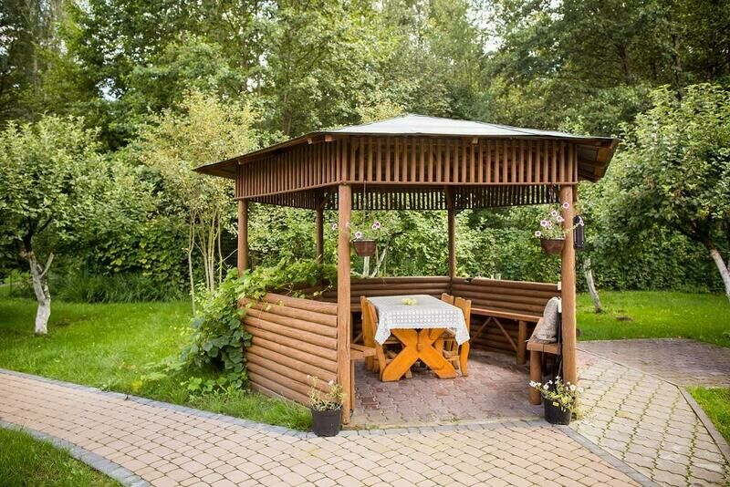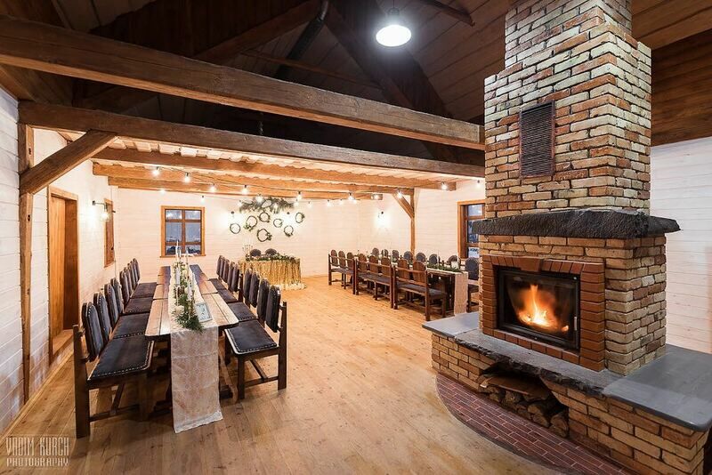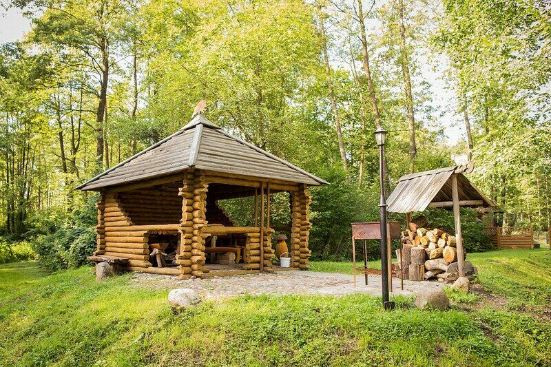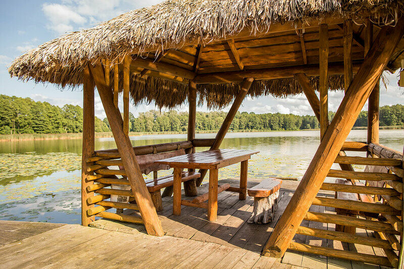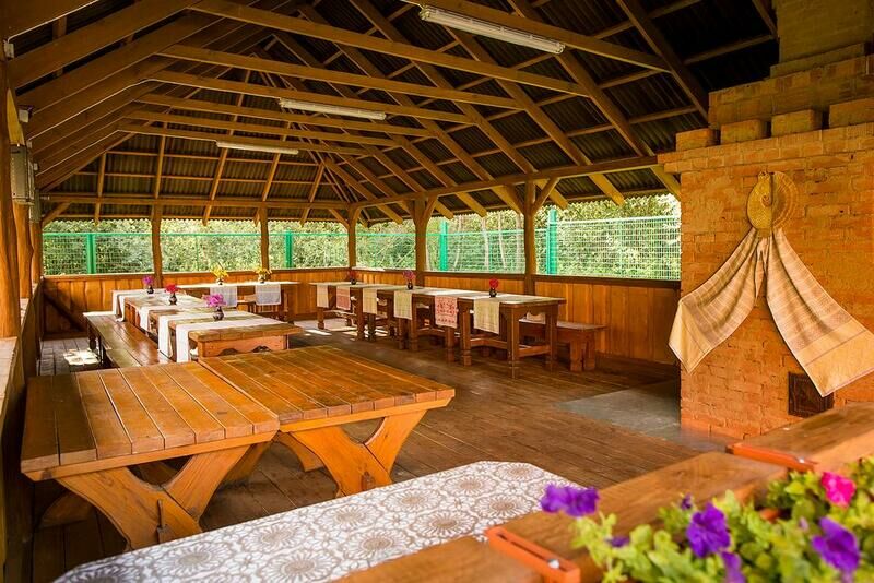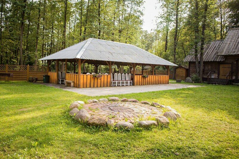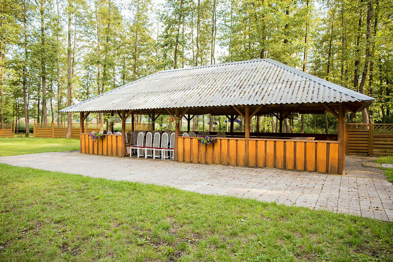 Масштабное праздничное мероприятие предлагается провести в большой деревянной беседке на 70 человек. Здесь есть печь-барбекю для приготовления вкусных блюд к праздничному столу. Для романтических встреч или уединения есть отдельная беседка-шале, стоящая на воде. В усадьбе под Гродно также есть благоустроенная территория: беседка с мангалом, пруд для рыбалки, фруктовый сад.