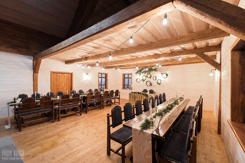 Деревянный банкетный зал отлично подойдет для празднования свадеб, корпоративов, юбилеев и других торжеств.