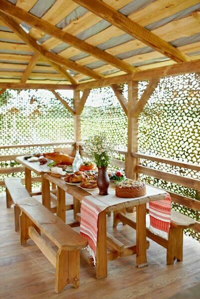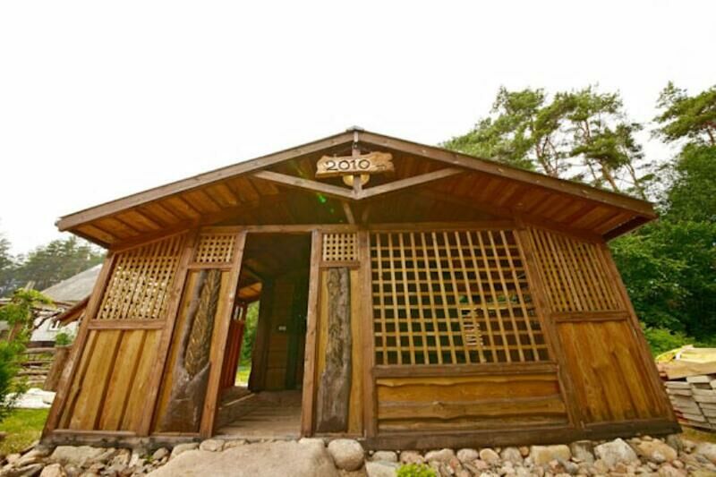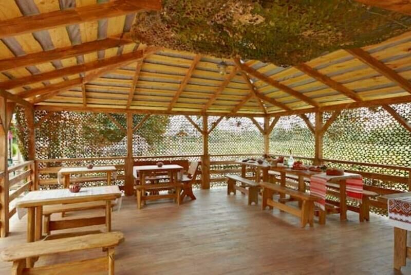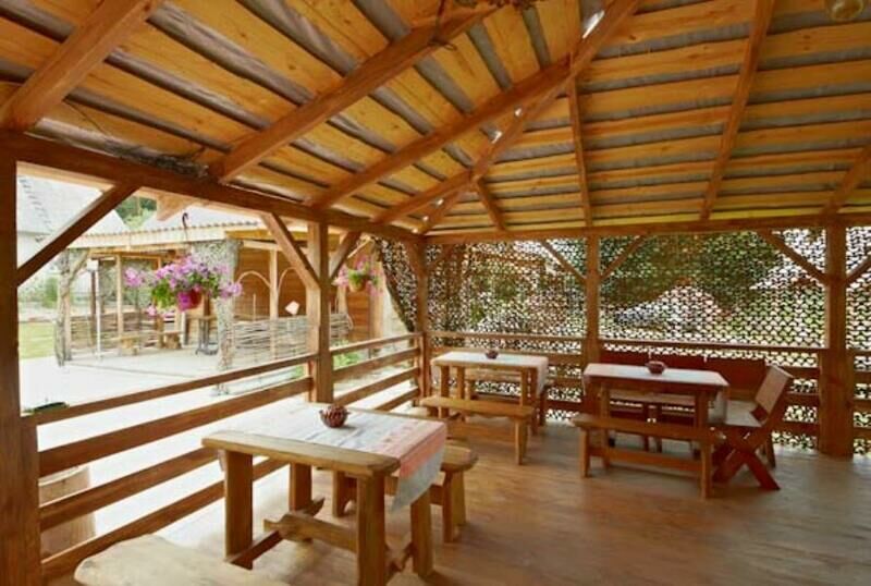Между домами расположено кафе вместимостью до 80 человек, которое отапливается камином, и крытый танцпол. Здесь можно проводить корпоративные и семейные торжества. Заказать банкет, музыкальное сопровождение праздника (дискотека или живая музыка), проведение обрядов и встреч в национальном стиле.