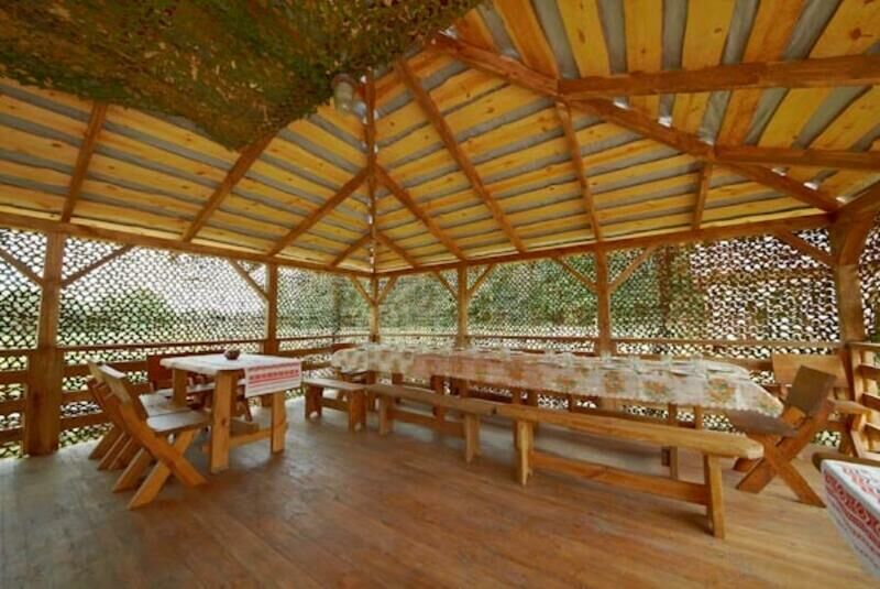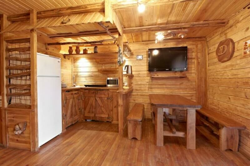Между домами расположено кафе вместимостью до 80 человек, которое отапливается камином, и крытый танцпол.