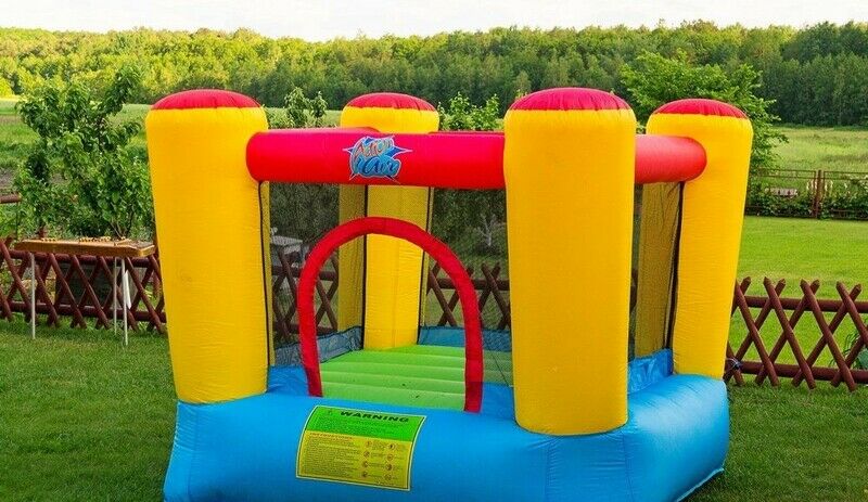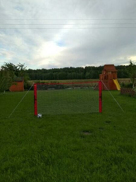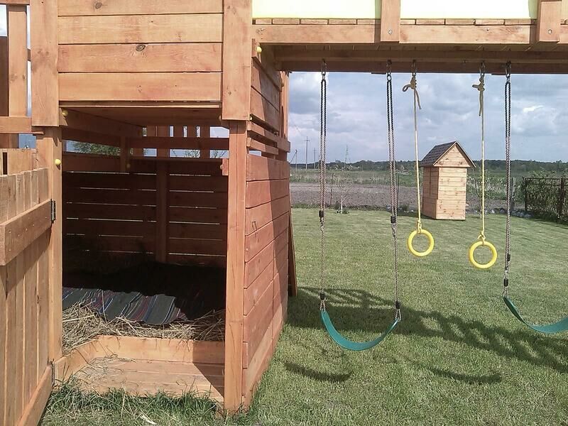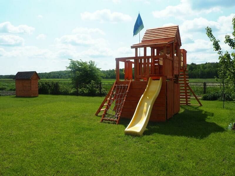 Детская площадка с качелями, горкой, канатной паутинкой, смотровой площадкой и с сеновалом. Также есть батут.