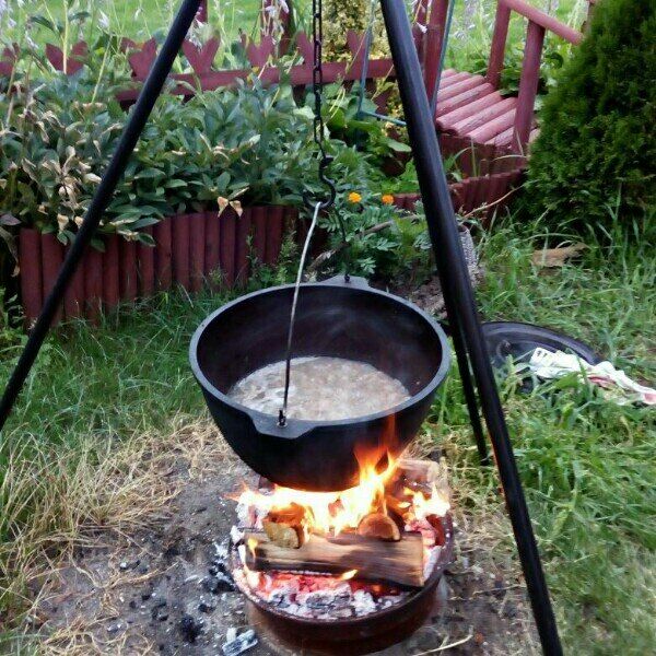С решеткой барбекю, казаном для ухи и лова, и удобным мангалом.