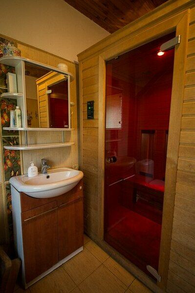 - 1 этаж: большая веранда + гостиная с камином + гостиная с ТВ + сан.узел с душевой кабиной и ИК-сауной + оборудованная кухня;