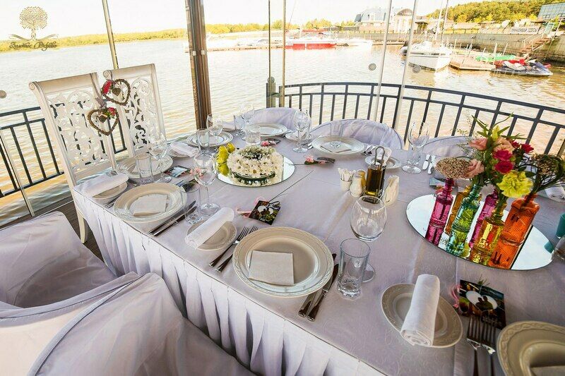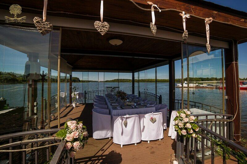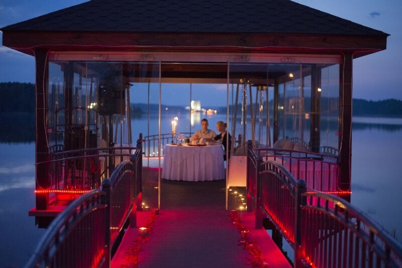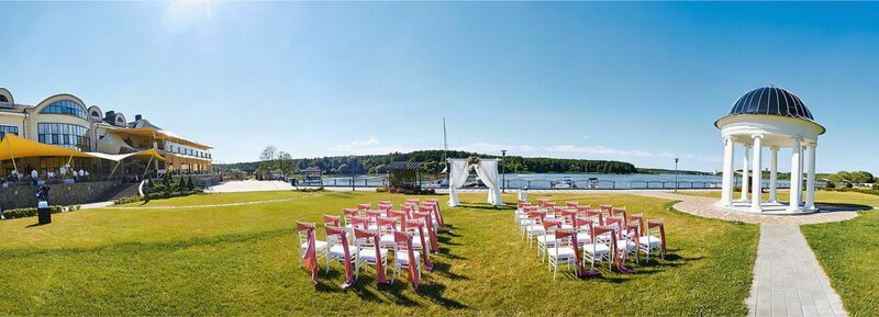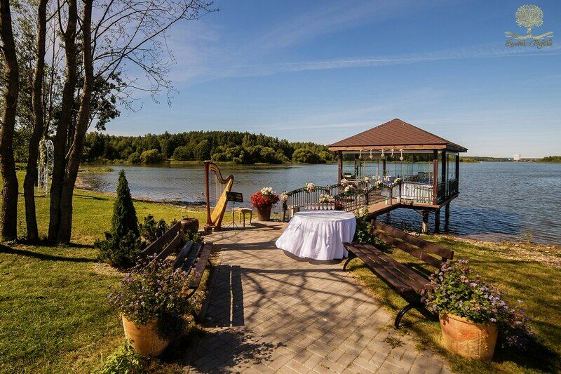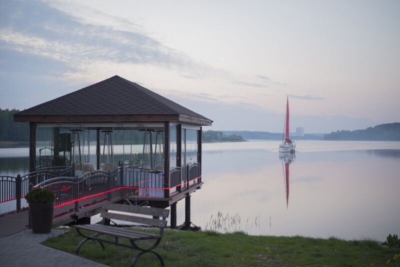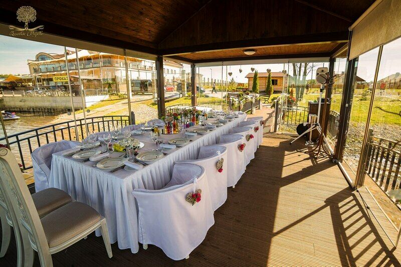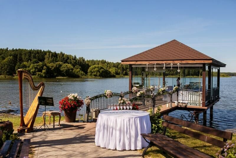 Также большой популярностью пользуется услуга «свадьба на Минском море», в остекленной беседке со специальным романтическим декором предусмотрено полное обслуживание стола официантом: доступен предзаказ по меню. По индивидуальной просьбе Ваше мероприятие будет сопровождать фоновая музыка или живой ансамбль, состоящий из скрипки, флейты и других классических инструментов.