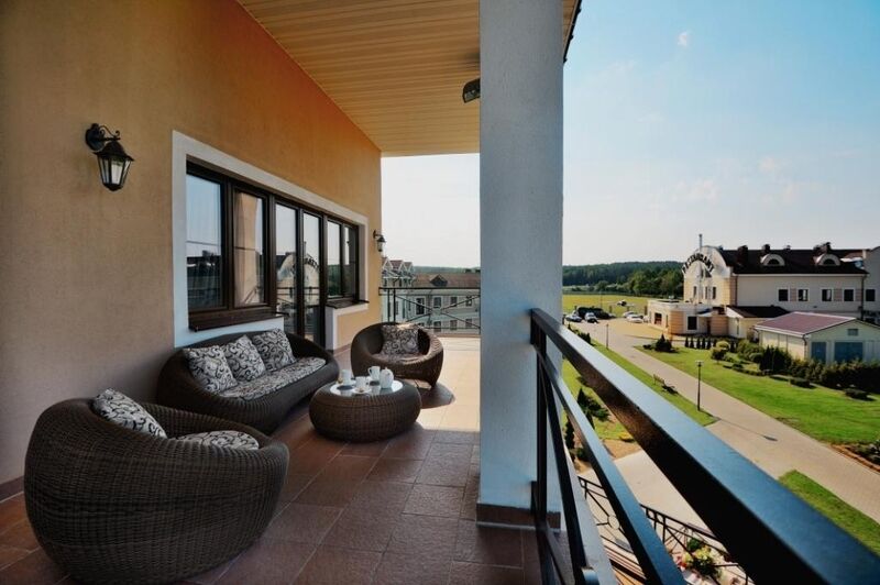 Огромный балкон с шикарным видом на Минское море и удобной ротанговой мебелью придает номеру неповторимость и уникальность. Площадь балкона 35 м2.