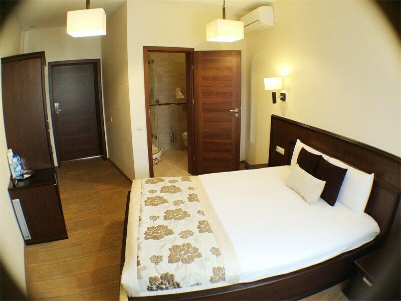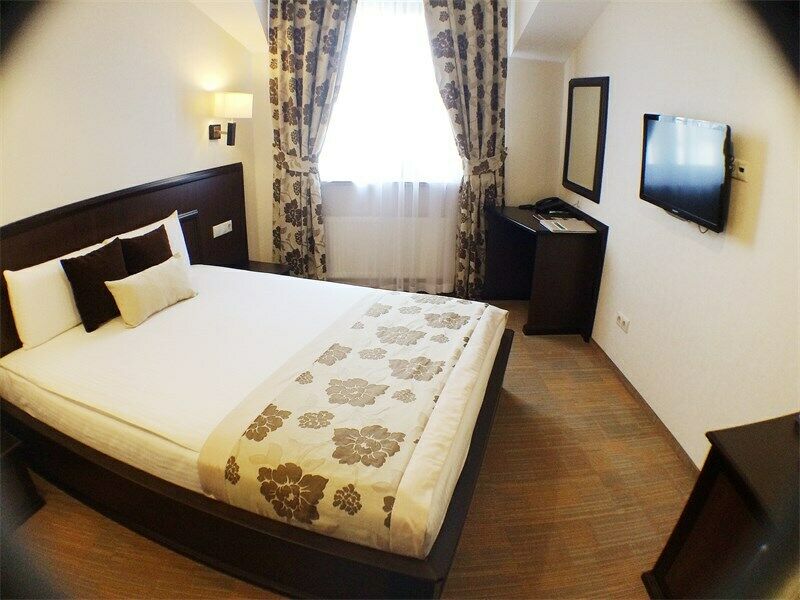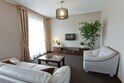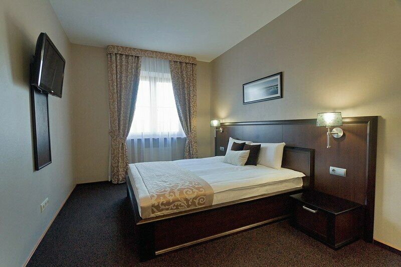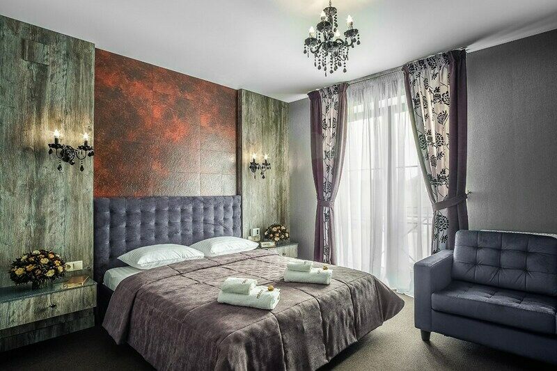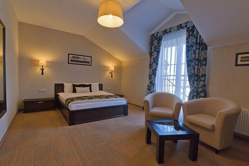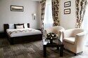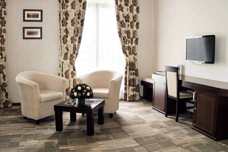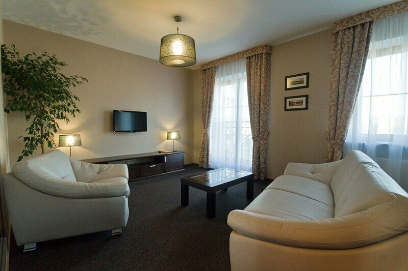 Номер улучшенного типа Люкс занимает вдвое большую площадь (43 м2), чем стандартный номер. В гостиной — уютная мягкая мебель и журнальный столик, LСD - телевизор, мини-бар, письменный стол, французский балкон. В спальне — широкая двуспальная кровать с ортопедическим матрасом (160x200), два удобных кресла и журнальный столик, LСD - телевизор.