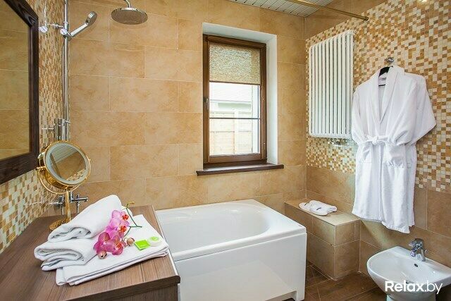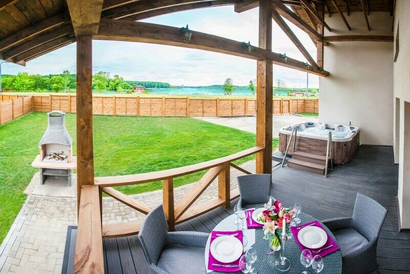 Просторный коттедж с 4 спальнями, гостиной, кухней и большой террасой с видом на Минское море, оснащенный джакузи на террасе и финской сауной.