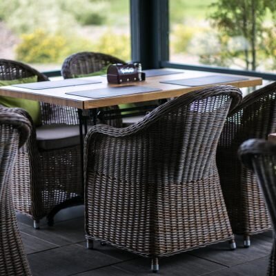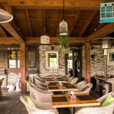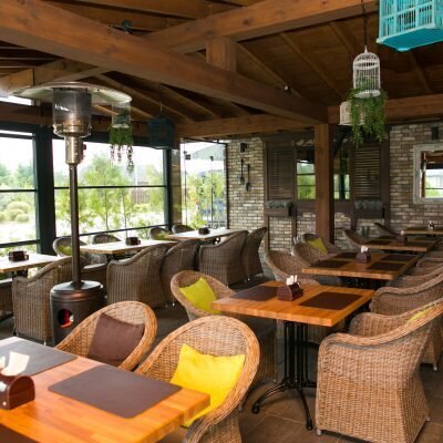 - 2 зала ресторана (на 60 мест — большой зал, до 20 мест — малый зал) и застекленная терраса до 30 человек;