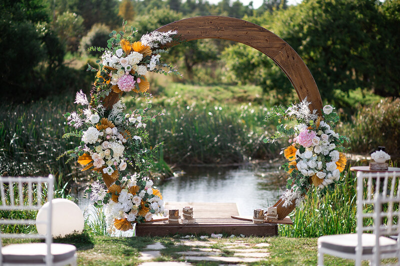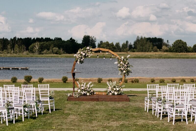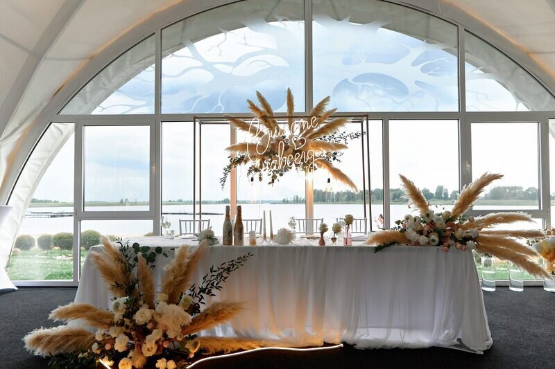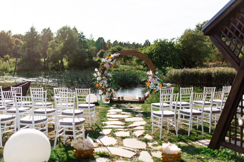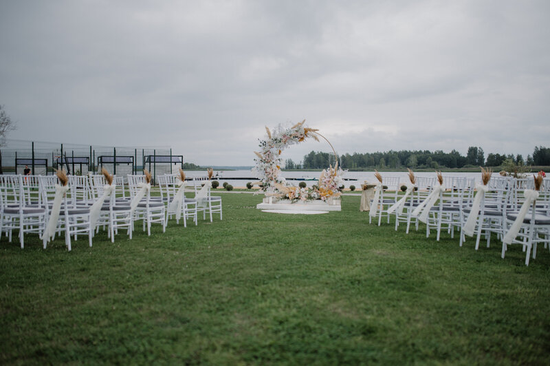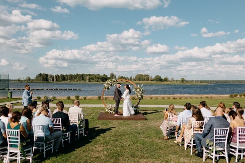 Это самая официальная и запоминающаяся часть свадебного дня. Может заменить официальную регистрацию или дополнить ее. В «Три медведя» можно разместить арку с любым декором. На площадке будут белоснежные стулья, которые можно также дополнительно украсить (например, красными лентами или нежными цветами).