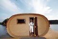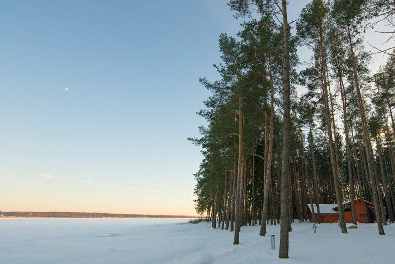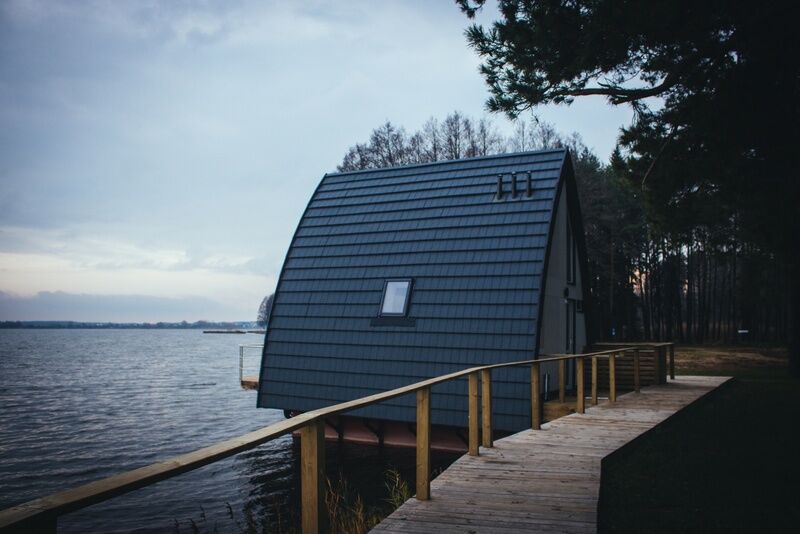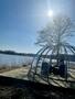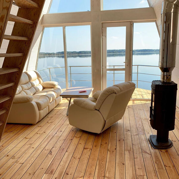 Рады представить вам наш новый дом на воде. Он имеет форму купола и огромное панорамное окно с видом на озеро и окружающий сосновый лес.