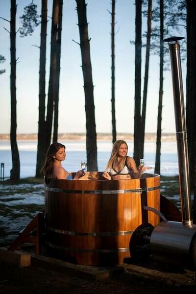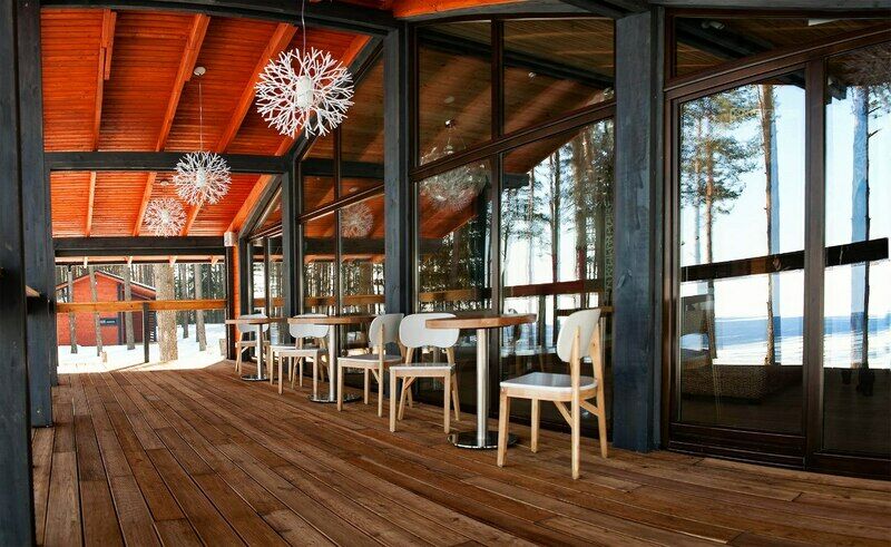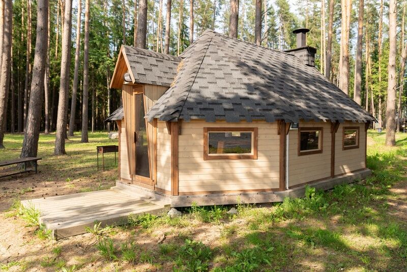 Домик VIP построен в эко-стиле, в нем приятно пахнет деревом, а окна в пол позволяют любоваться прекрасными видами на лес и озеро отовсюду. Размер дома: 60 м².