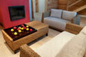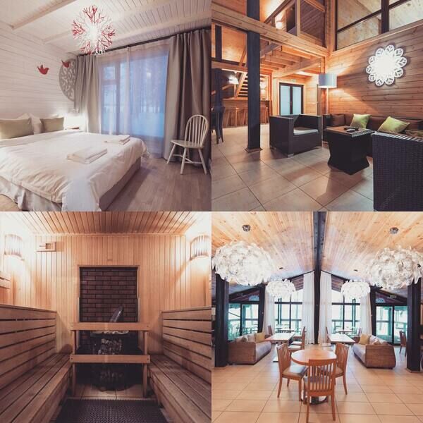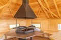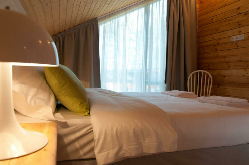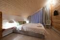 В домике 2 комнаты для отдыха с двуспальными кроватями, на первом и втором этажах. А так же гостиная с камином и верхним светом. Для удобства гостей предусмотрены две душевых комнаты, фен, телевизор на стене, холодильник для вина. Плотные шторы обеспечивают комфортный полноценный сон, а теплый свет ламп создает уют в вечернее время.