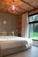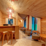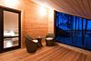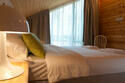 Номер находится на втором этаже домика, построенного из соснового бруса. Благодаря индивидуальному дизайну в нем уютно и приятно пахнет деревом. Одна из стен полностью стеклянная, что позволяет любоваться красотой леса и озера лежа в кровати. Размер номера 30 м².