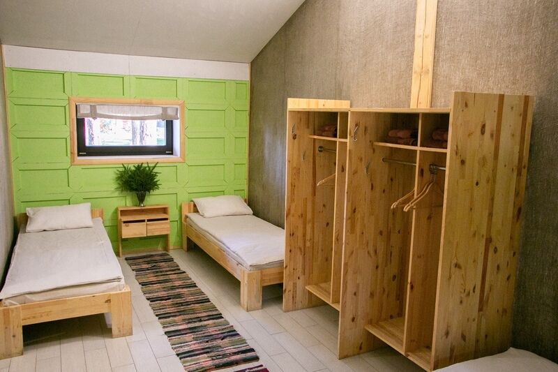 Номер находится на первом этаже домика, построенного из соснового бруса. Благодаря индивидуальному дизайну в нем уютно и приятно пахнет деревом. Одна из стен полностью стеклянная, что позволяет любоваться красотой леса и озера лежа в кровати. Размер номера 20 м².