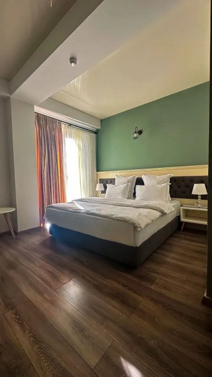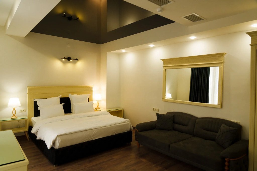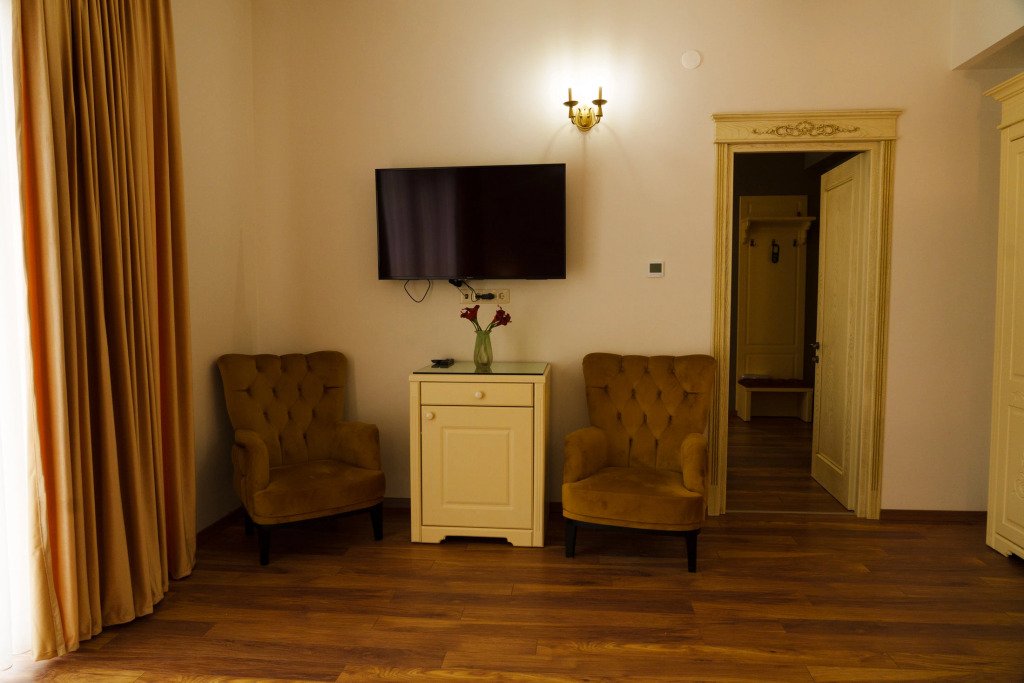 В номере вы найдёте телевизор, мини-бар и халат. Оснащение зависит от выбранной категории номера.