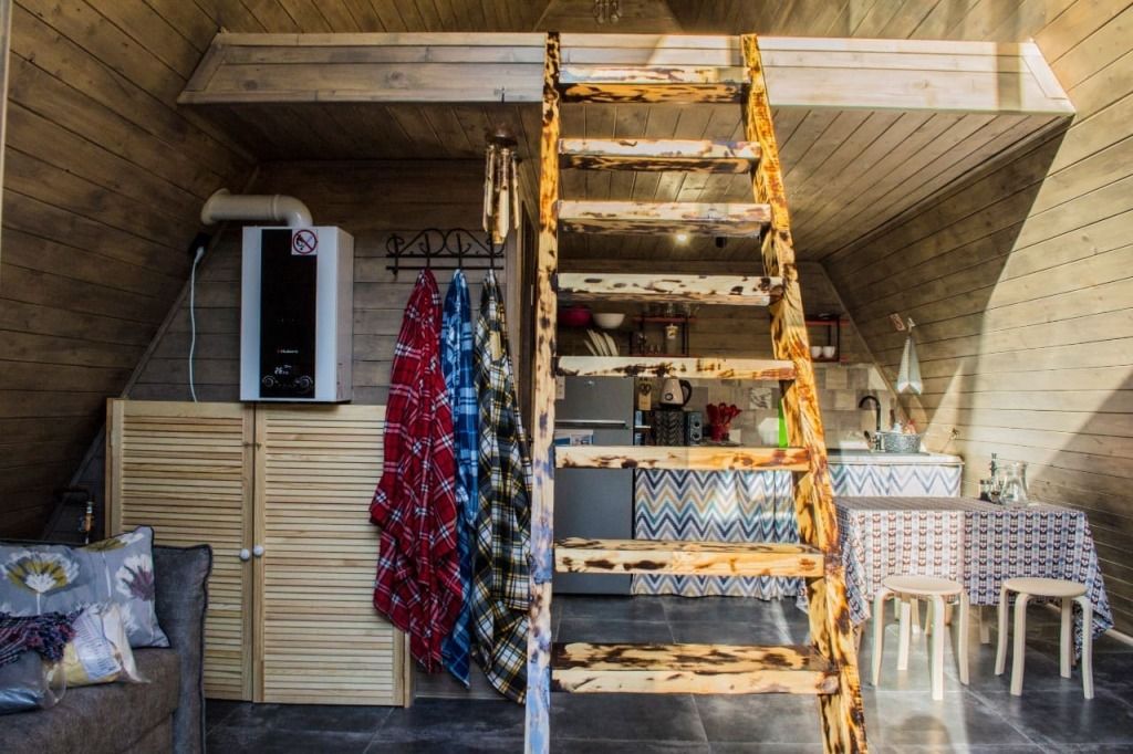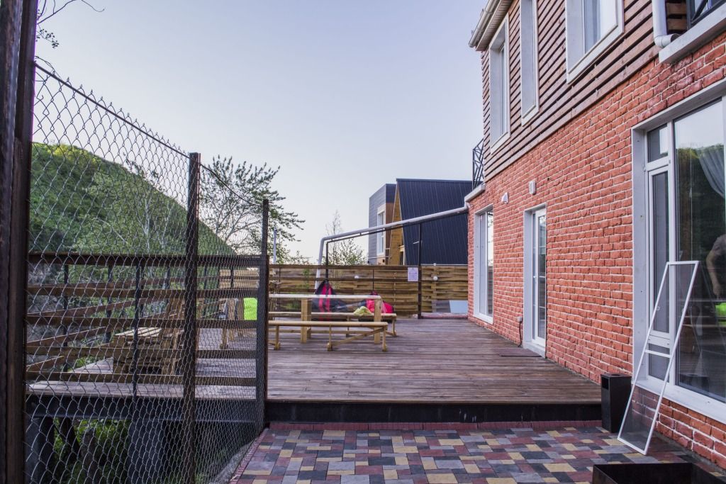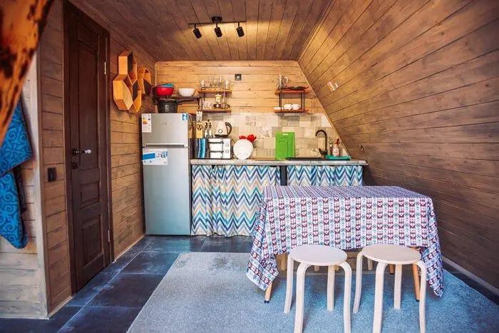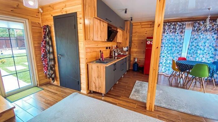 Для удобства есть обливное ведро, сан узел с биде. В зоне отдыха стол с лавочками и кружки для пива.