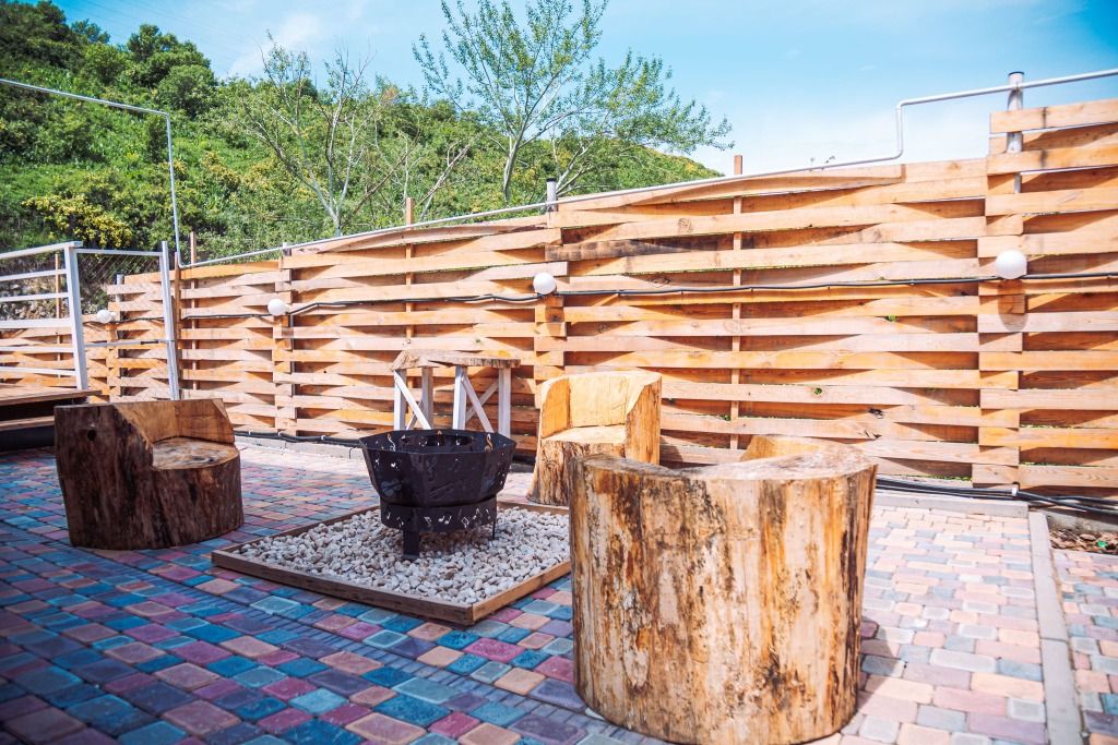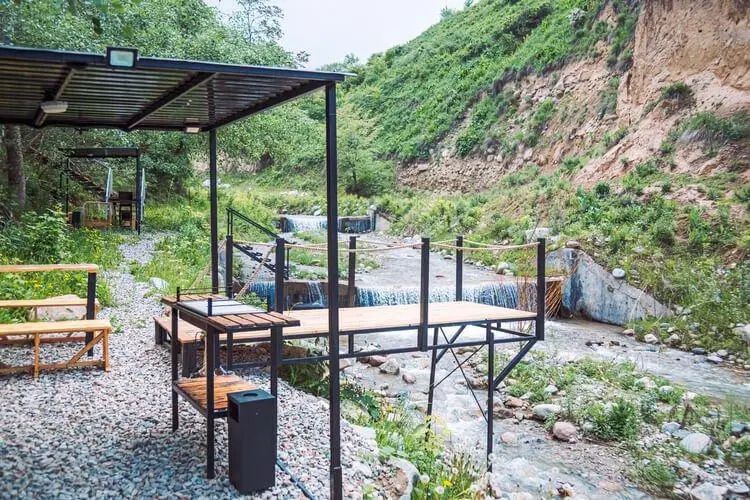 - На реке у каждого свой стол с лавочками, зона барбекю под навесом, мангал, мост прямо над рекой;