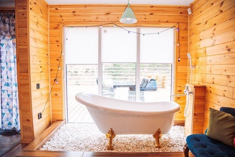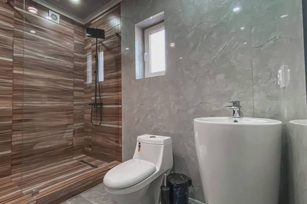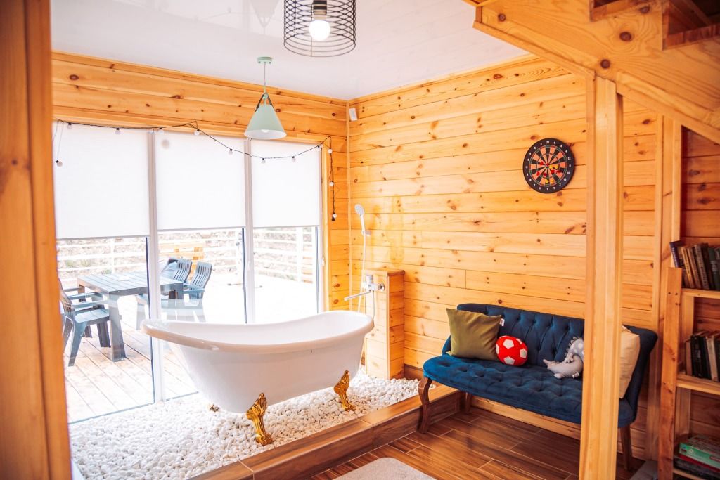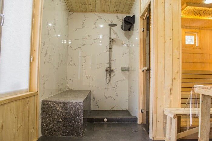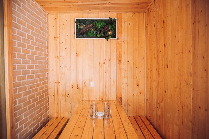 Баня выполнена в современном стиле, с гималайской солью и можжевельным полотном. Уникальные тона интерьера и отделка из дерева придают натуральность и спокойствие.