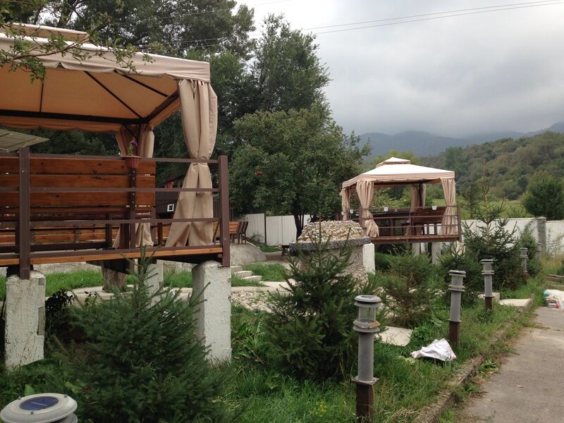 - В вашем распоряжении: каминный зал, прекрасный зал для торжеств, беседка для приготовления национальных блюд на открытом огне, смотровая площадка, яблоневый сад с асфальтированными дорожками, место отдыха у горной речки и пруда. Концертная площадка и караоке на открытом воздухе.