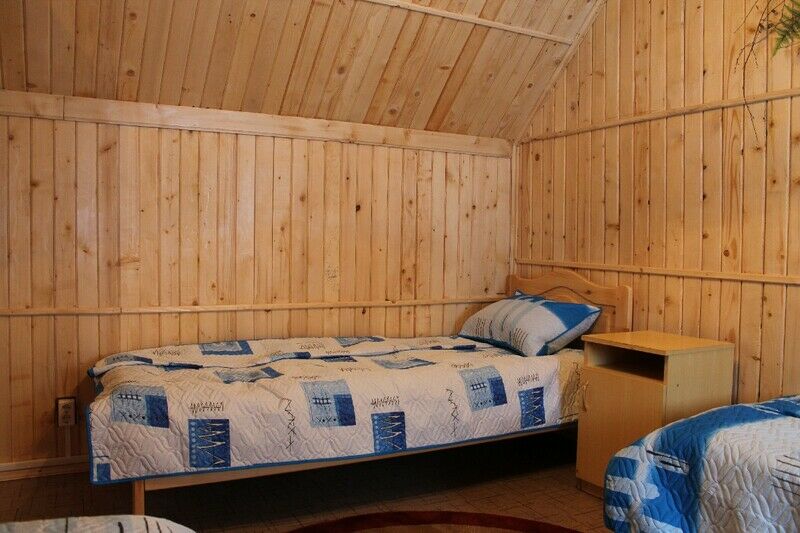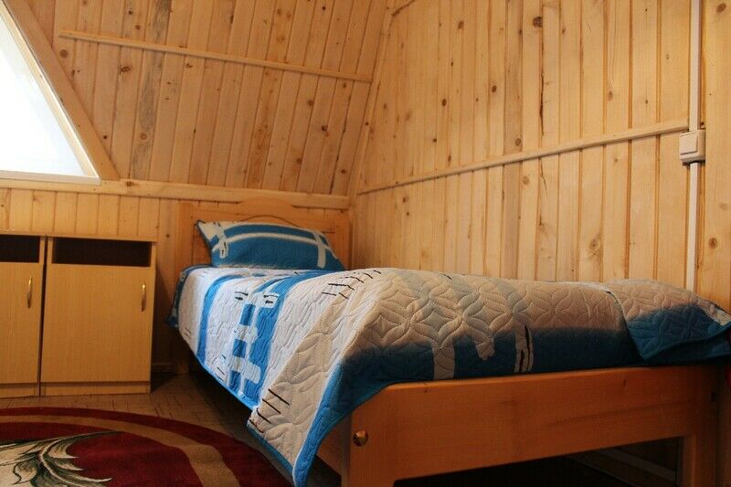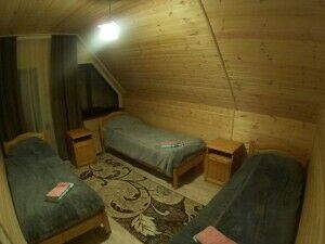 - 3 односпальных деревянных кровати с тумбочками расположены в гостевой комнате.