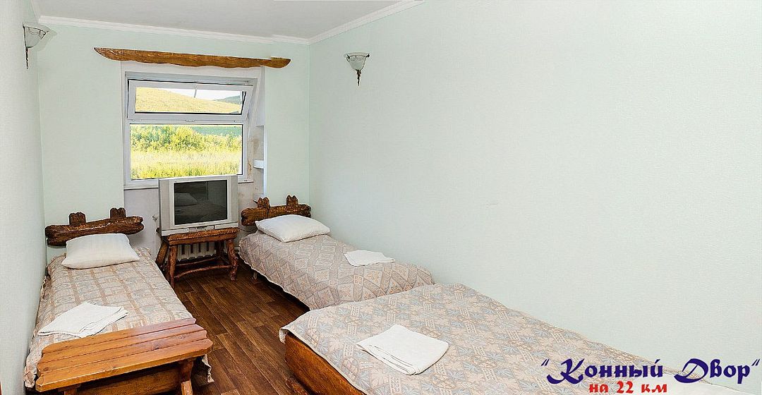 Одна двуспальная и две односпальные кровати из массива натурального дерева, санузел в номере (холодная и горячая вода), телевизор