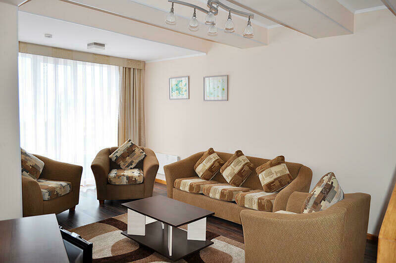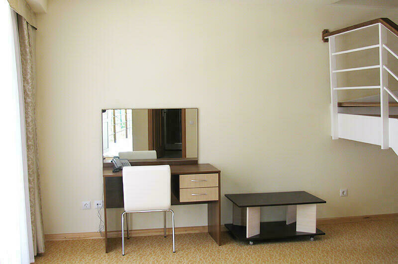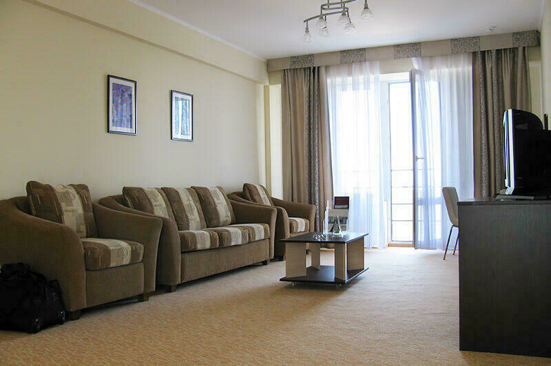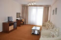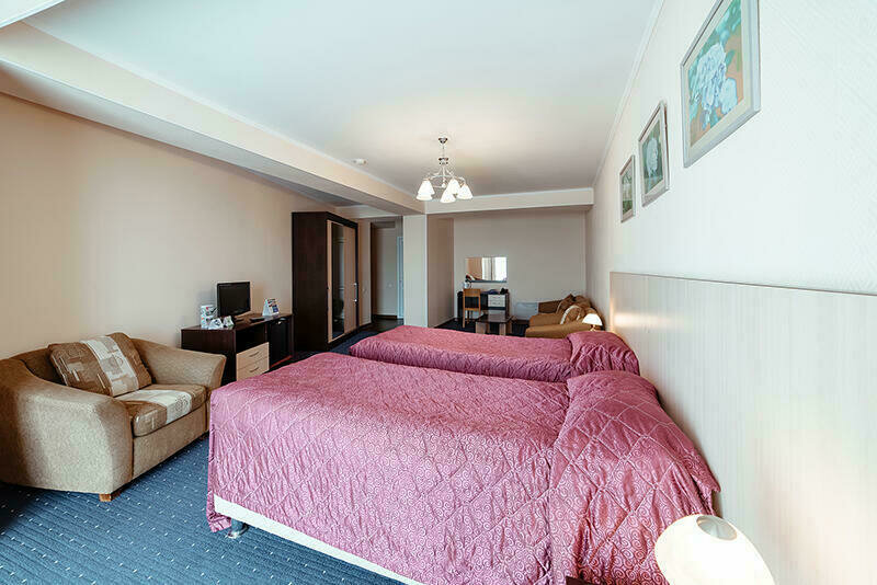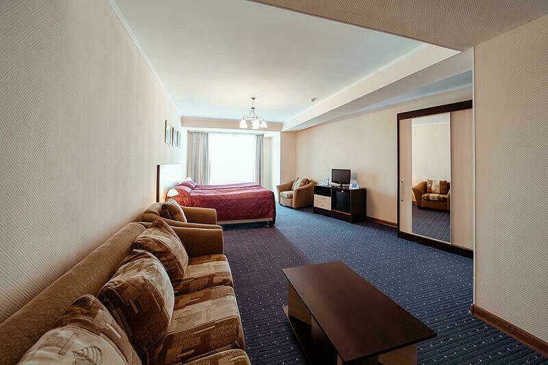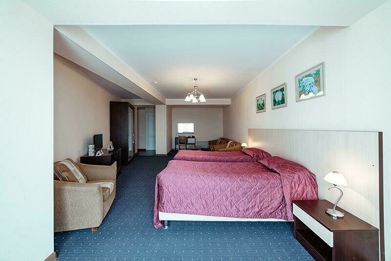 44 кв.м, две кровати (сдвигаются), прикроватные тумбочки, раскладной диван с 2 креслами, шкаф-купе, журнальный столик, стол, стул, тумба, мини-бар, ТВ, сейф, телефон, интернет, фен, эл. чайник. С/у, ванна