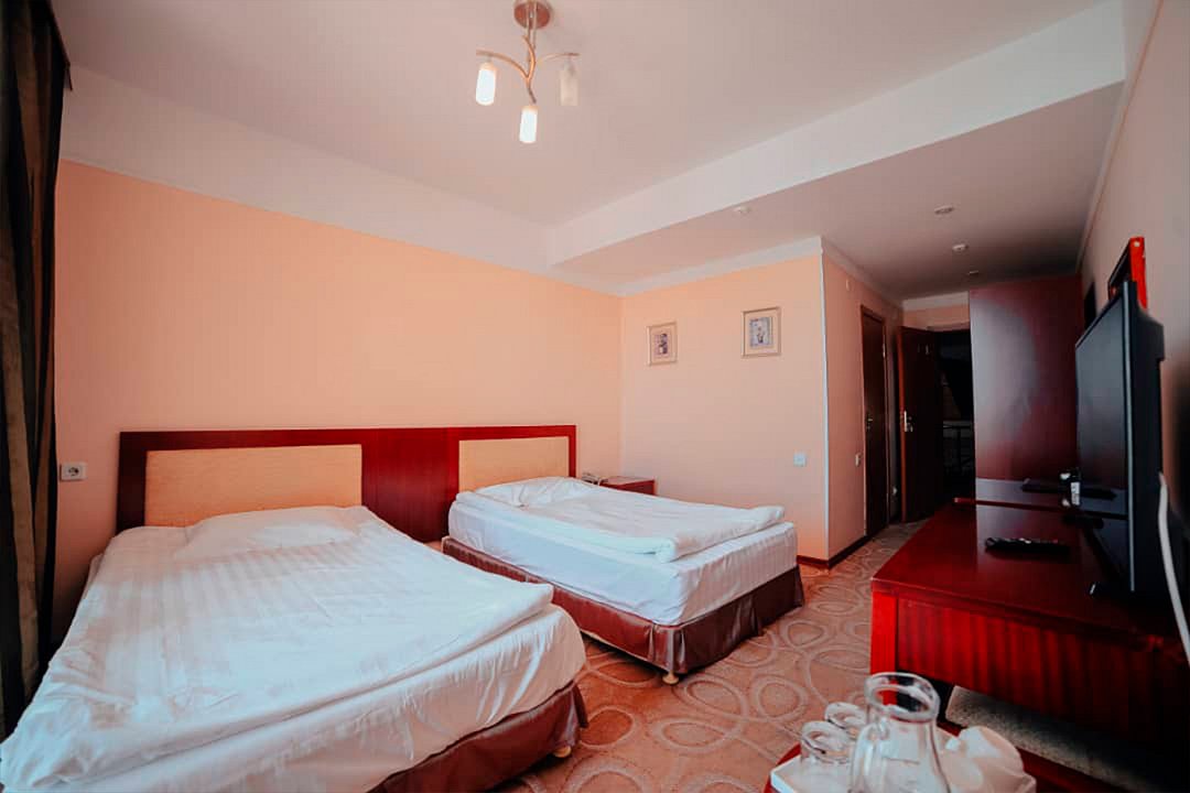 раздельные кровати, прикроватные тумбочки, журнальный стол, шкаф, ТВ, санузел и душ, Wi Fi, мыло, шампунь.