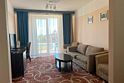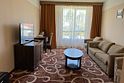 двуспальная кровать, прикроватные тумбочки, журнальный стол, шкаф, два кресла, ТВ, санузел и душ, Wi Fi, тапочки, фен, мыло,