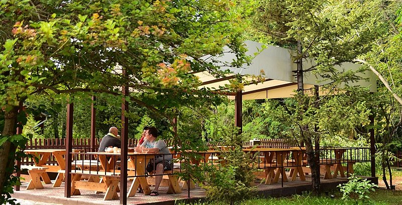 Кафе расположено в одном из самых красивых мест на территории Центра отдыха «Радуга». Деревянные беседки с воздушными занавесками, как островки, окружены тенью многолетних деревьев. Вечером усиливается ощущение таинственности и ожидание чуда.