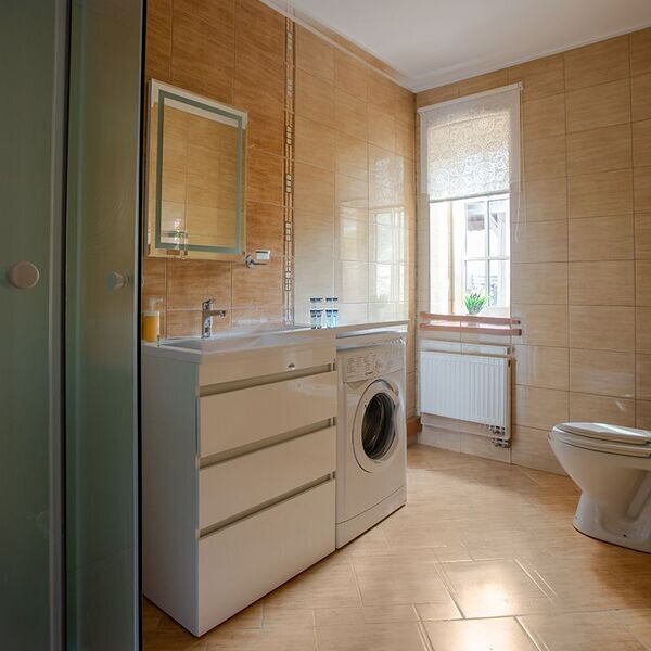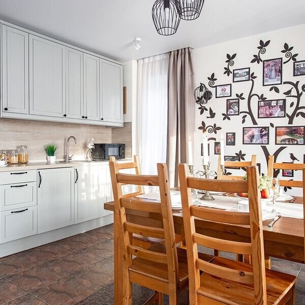 На первом этаже особняка расположена просторная гостиная с мягкой мебелью и электрическим камином, большим TV и обеденной зоной. В вашем распоряжении полностью оборудованное кухонное пространство, со всей необходимой бытовой.