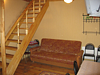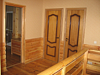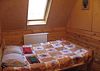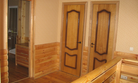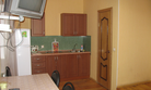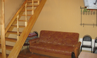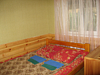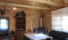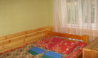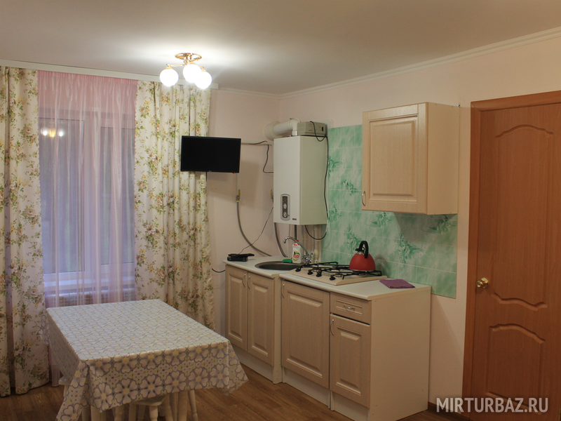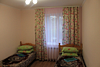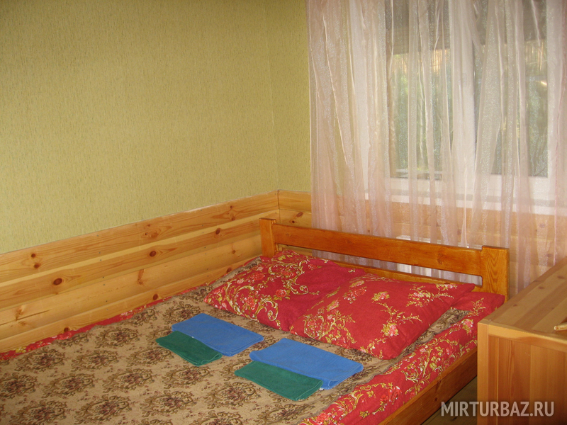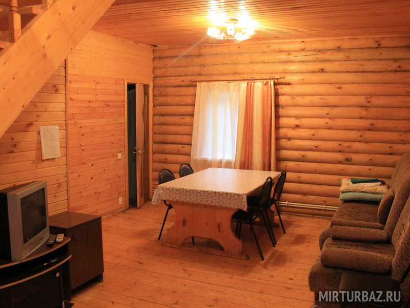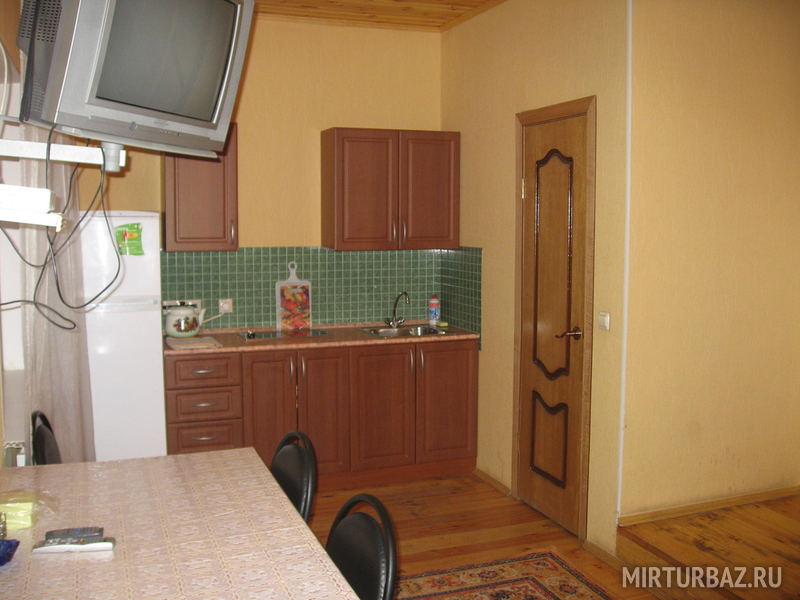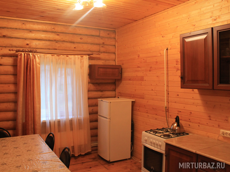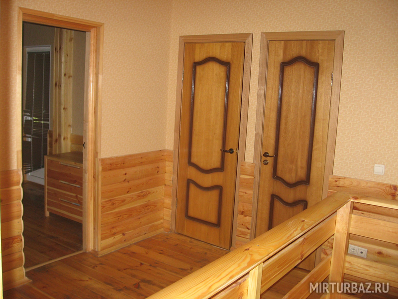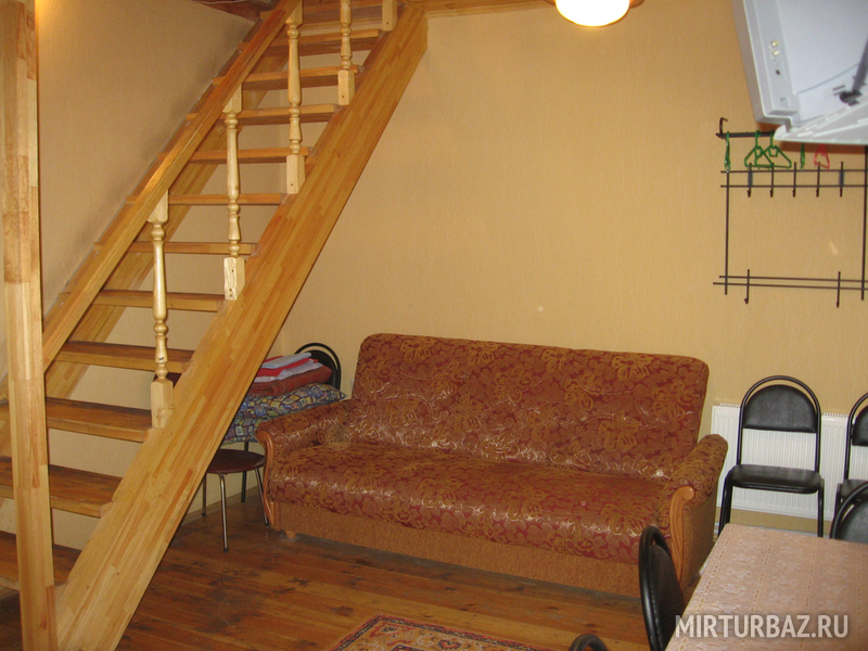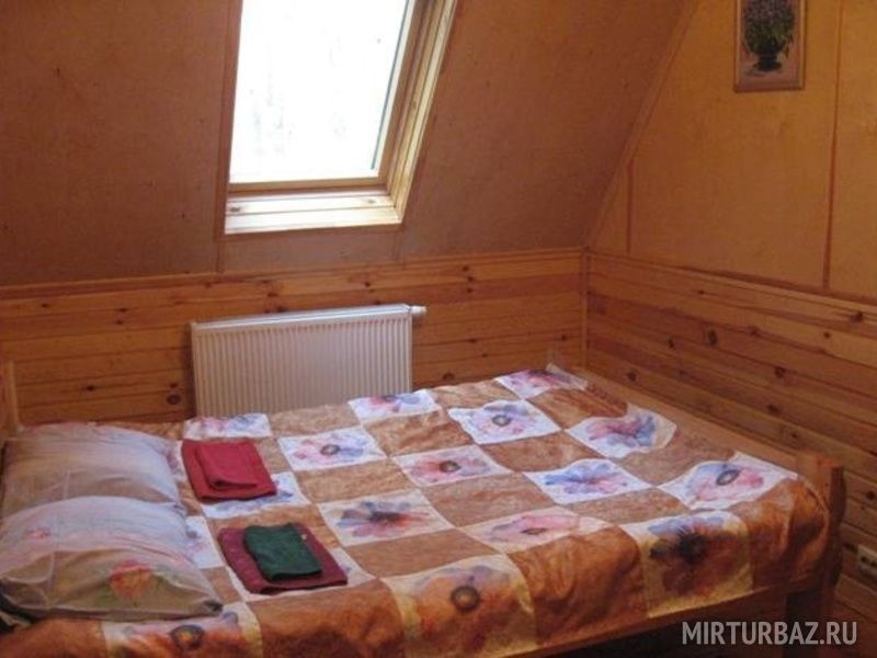 Двухэтажный гостевой дом с двумя входами. На первом этаже в общем холле установлены двуспальный раскладной диван и телевизор, имеется санузел с душевой и кухня с холодильником и посудой. На втором этаже три спальни, в первой две двуспальные кровати, во второй одна двуспальная, в третьей полуторная.