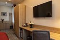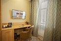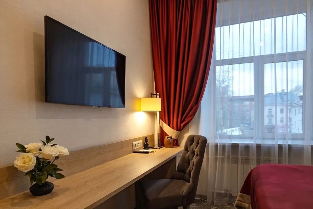 телевизор, кабельное телевидение, интернет, телефон, кондиционер, фен, утюг, душевая кабина, халаты, банные полотенца, тапочки, косметические средства, полутораспальная кровать, шкаф для одежды, письменный стол, багажная тумба, зеркало, мини-бар, вид на город, кресло, внутренний телефонВ гостиничном номере