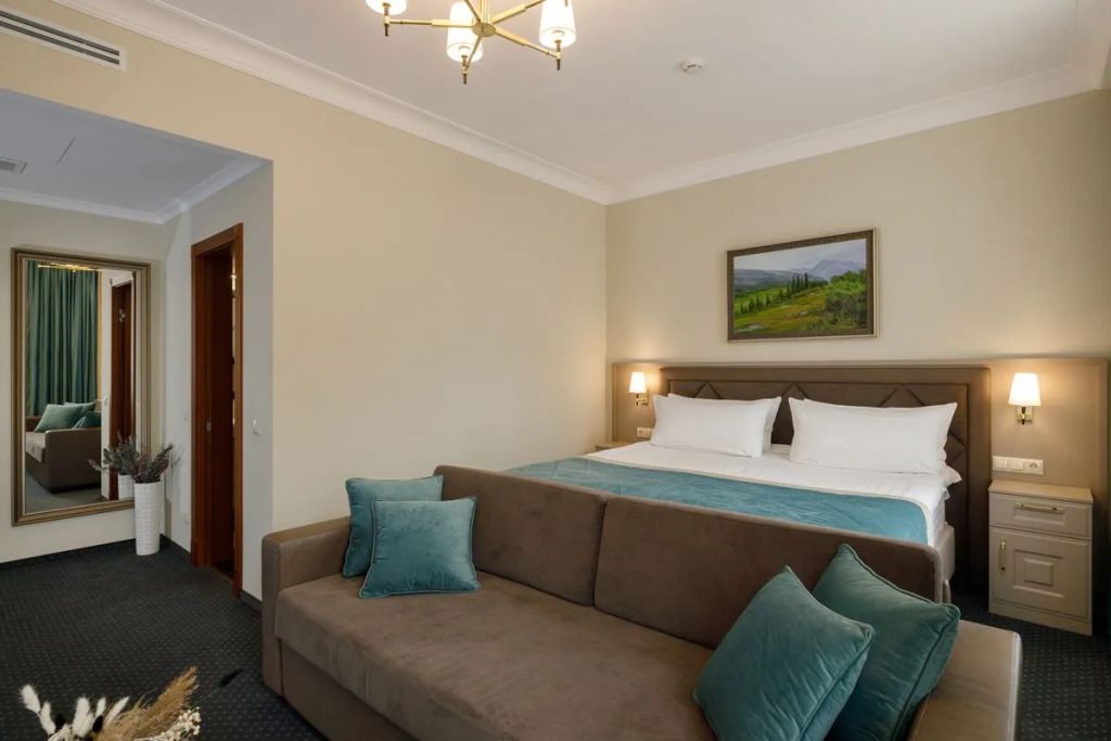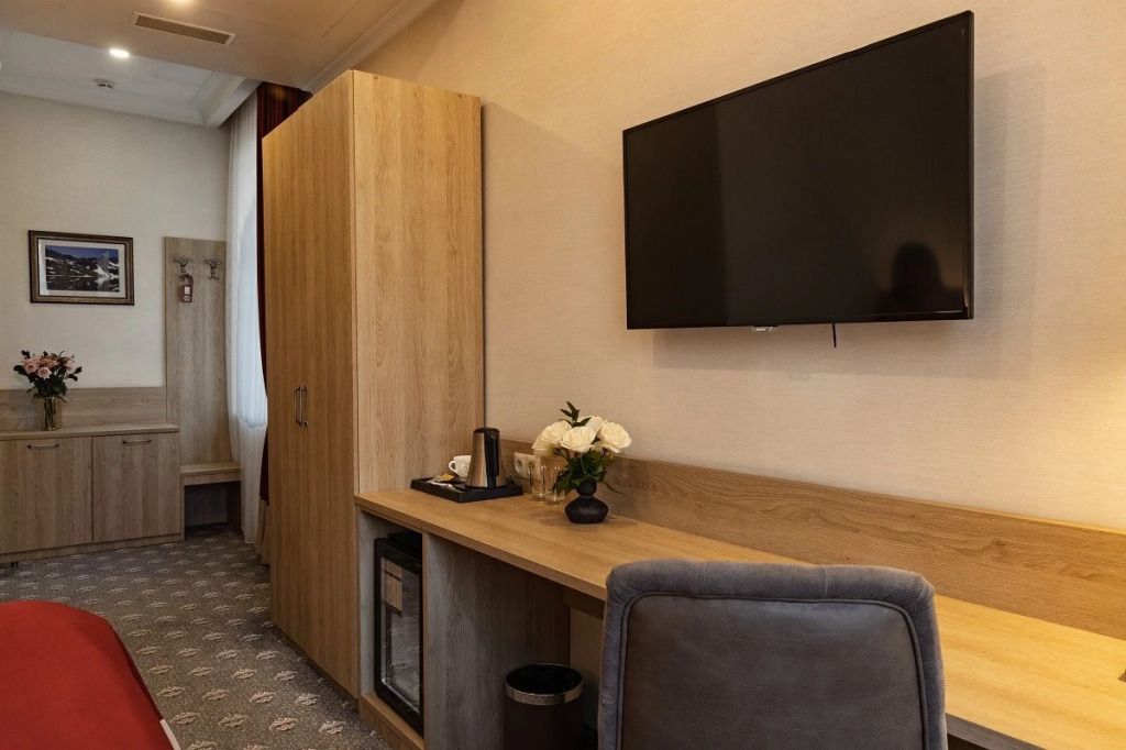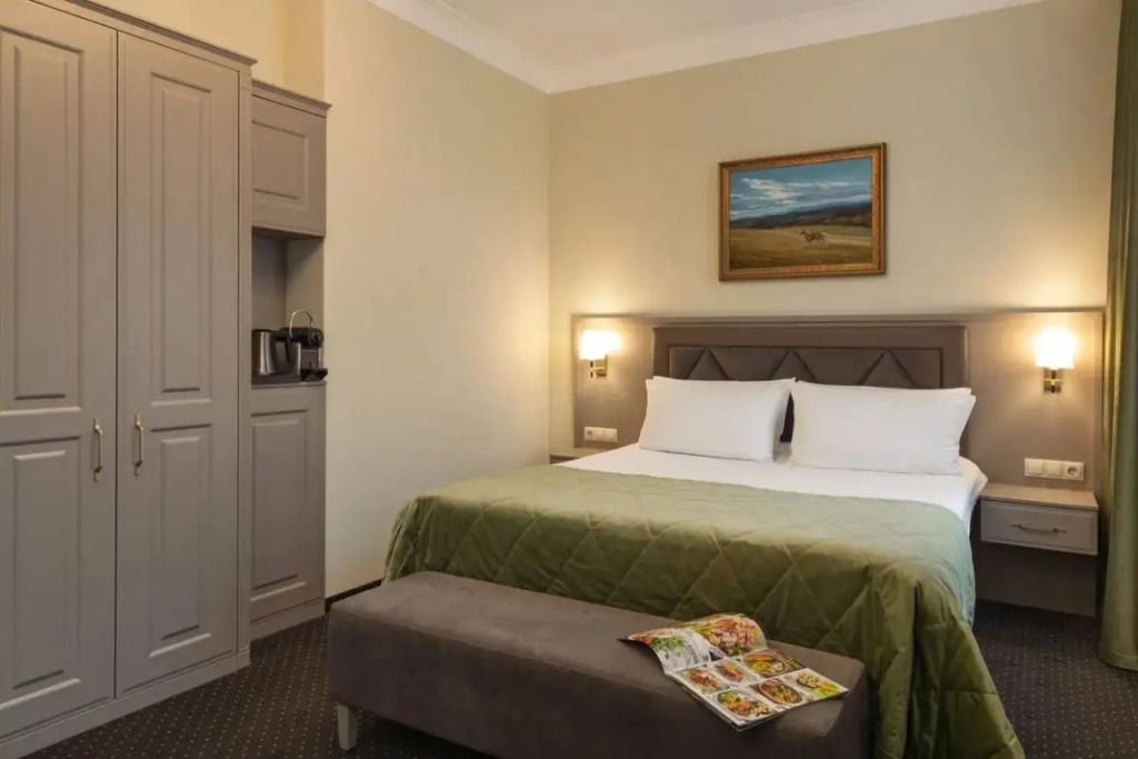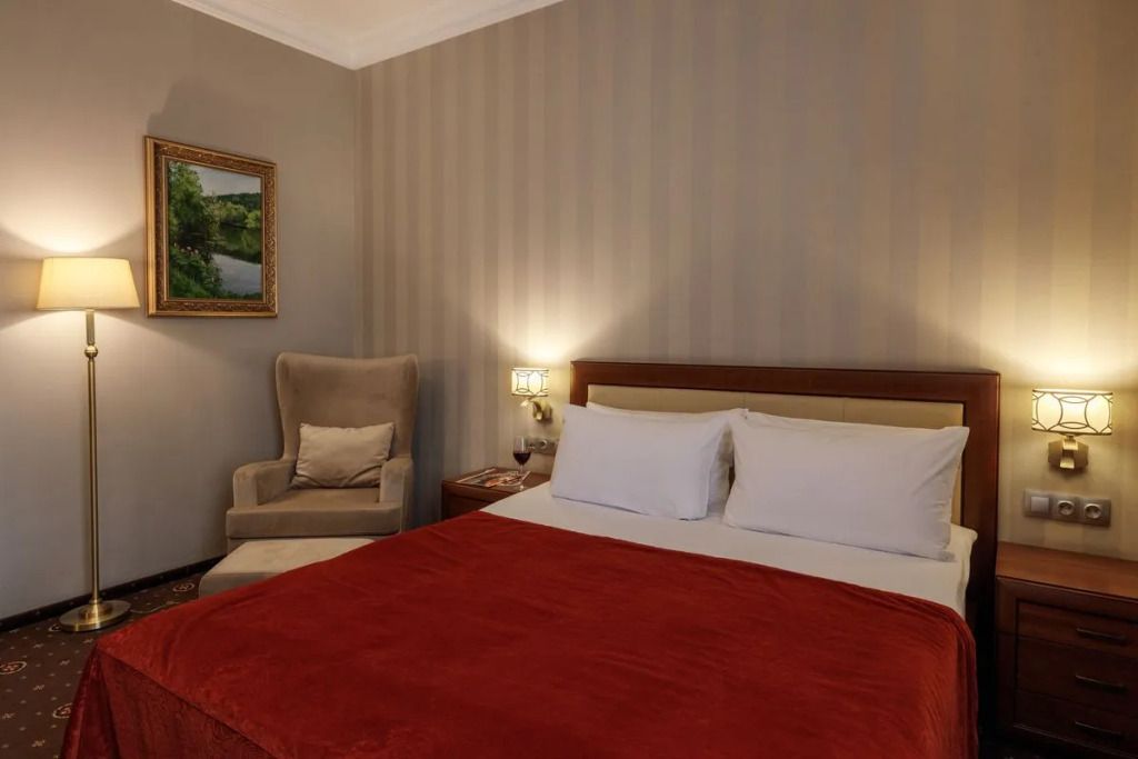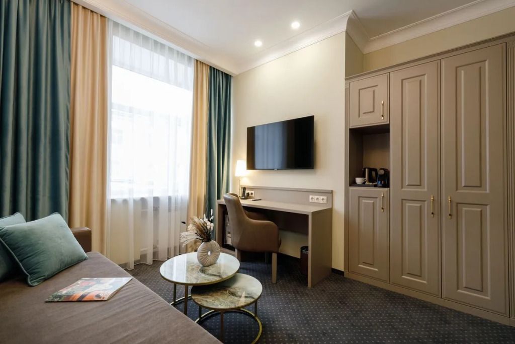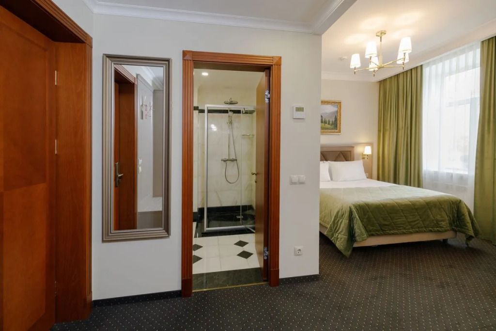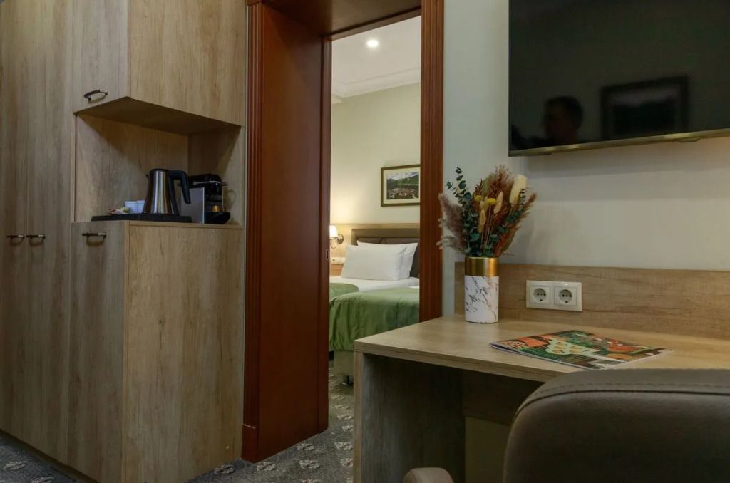 Представительский, элегантный номер после реновации. В Вашем распоряжении индивидуальная система кондиционирования, два телевизора, сейф, фен, мини-бар, чайная станция, кофемашина, гладильный центр, набор белоснежных полотенец, халат, тапочки и косметический набор.Услуги и удобства