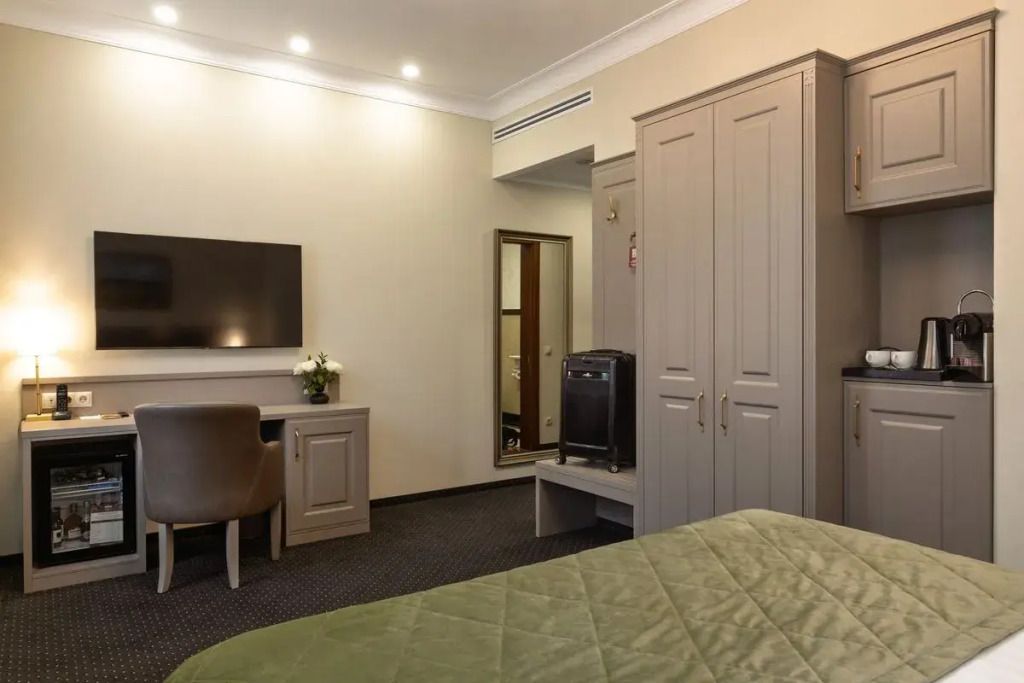 Номер после реновации 2023-2024 г. В каждом номере двуспальная кровать с матрасом "Аскона" премиум-линейки, эргономичное рабочее место, бесплатный Вай-фай и ЖК-ТВ с отличным выбором каналов , кофе-машина, кондиционер, сейф, мини-бар, фен,халат, тапочки тропический душ.Услуги и удобства