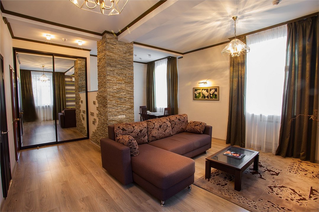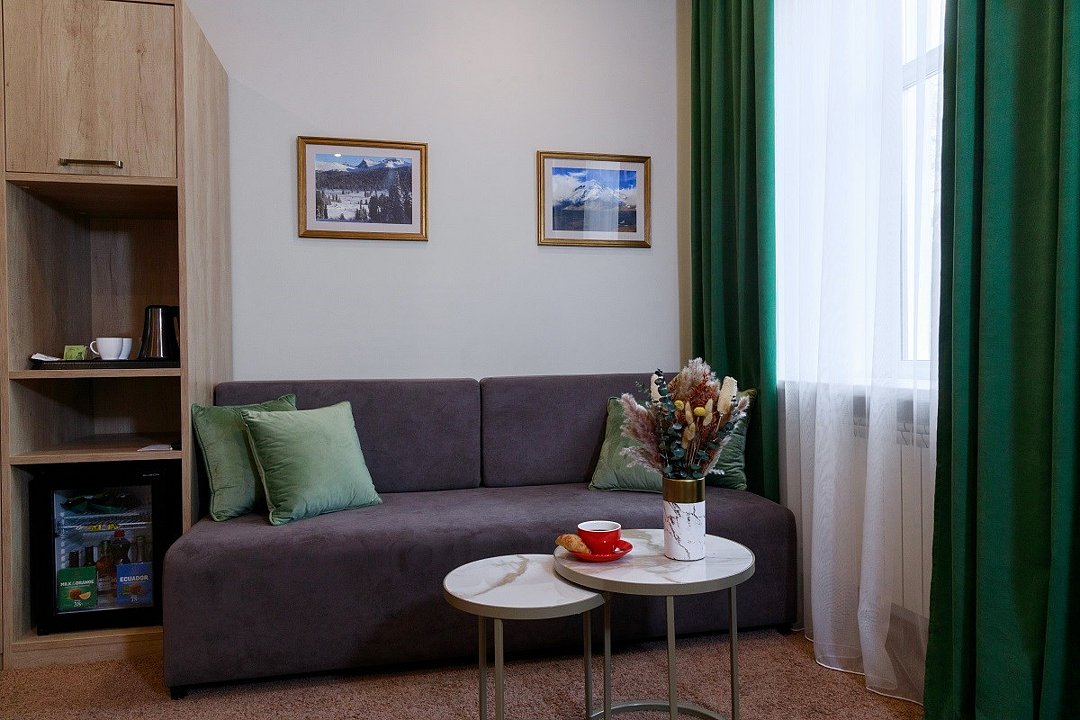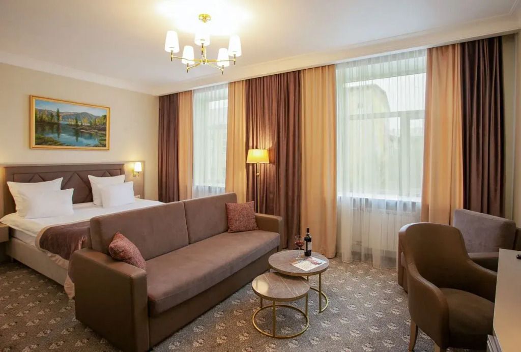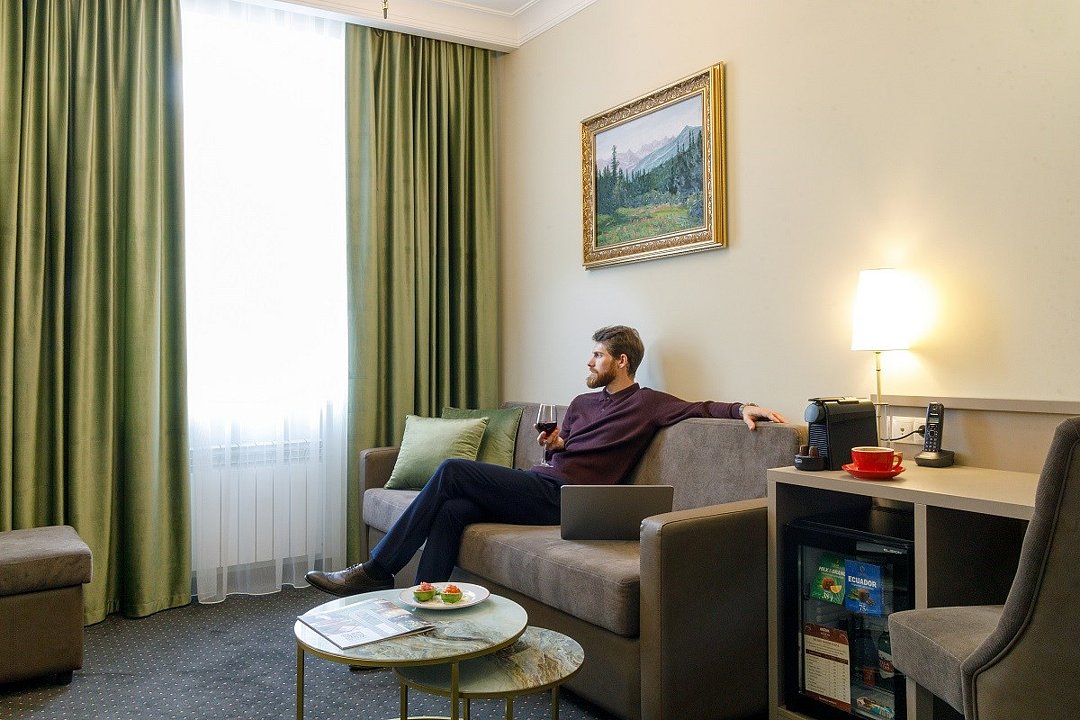 Двухкомнатный номер с видом на город (на уютный сквер и центральный проспект). Гостиная разделена на несколько зон: обеденную, рабочую и зону отдыха. В спальне удобная двуспальная кровать 180см*200см, ортопедический матрас. 2 ЖК ТВ с отличным выбором каналов . Просторный рабочий стол, оборудованный радиотелефоном Чайная станция, микроволновая печь Бесплатный беспроводной доступ в Интернет (Вай-фай) мини-бар, кофемашина, фен, сейф,халат, тапочки.Услуги и удобства