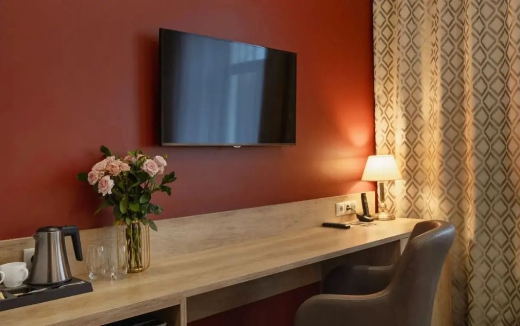 телевизор, кабельное телевидение, интернет, телефон, кондиционер, фен, утюг, душевая кабина, халаты, банные полотенца, тапочки, косметические средства, двуспальная кровать, гладильная доска, шкаф для одежды, письменный стол, багажная тумба, зеркало, набор посуды, обслуживание номеров, информационная карта, меню, сейф, ковровое покрытие, вид на город, вид во двор, меню подушек, номер для некурящих, чайная станция, набор для приготовления чая и кофе, бутилированная вода, мини-бар (платно), коворкингВ гостиничном номере