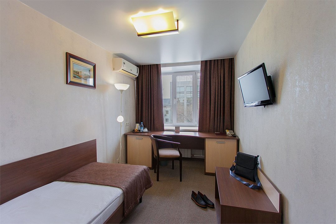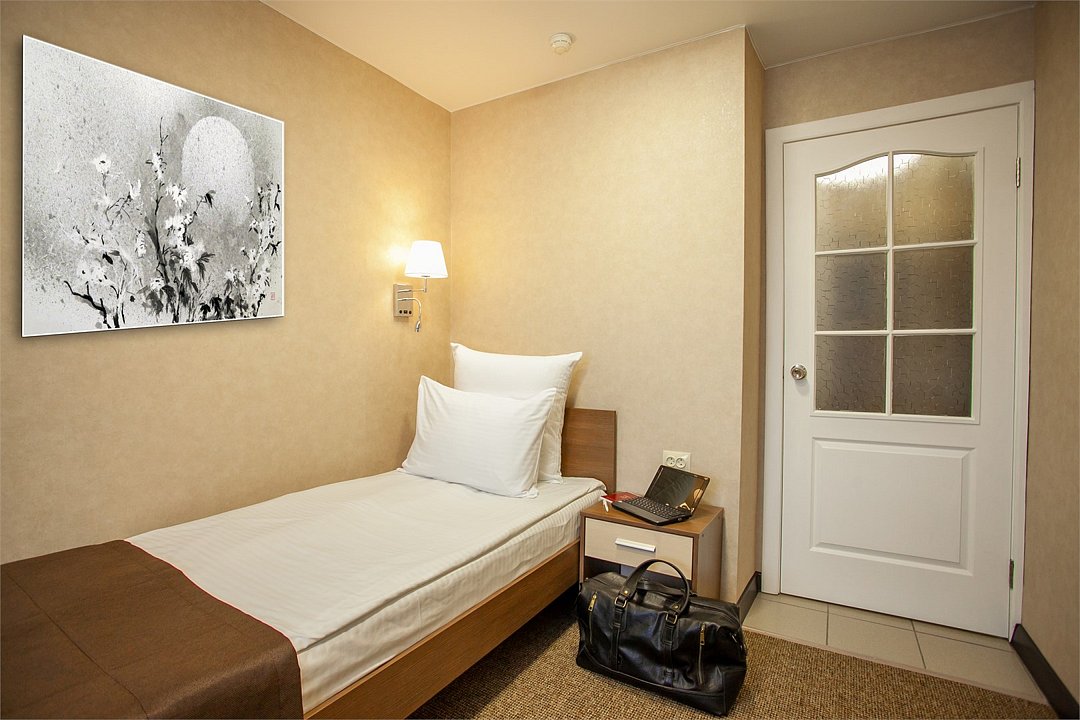Одноместный компактный номер с простым дизайном и большим количеством различных удобств. Это оптимальный вариант размещения на сутки или другой непродолжительный срок. В стоимость номера включена бесплатная парковка, бесплатный высокоскоростной wi-fi, бесплатное пользование водой из кулера на этаже, пользование сейфовыми ячейками на ресепшн, вызов такси, побудка и т.д.Услуги и удобства