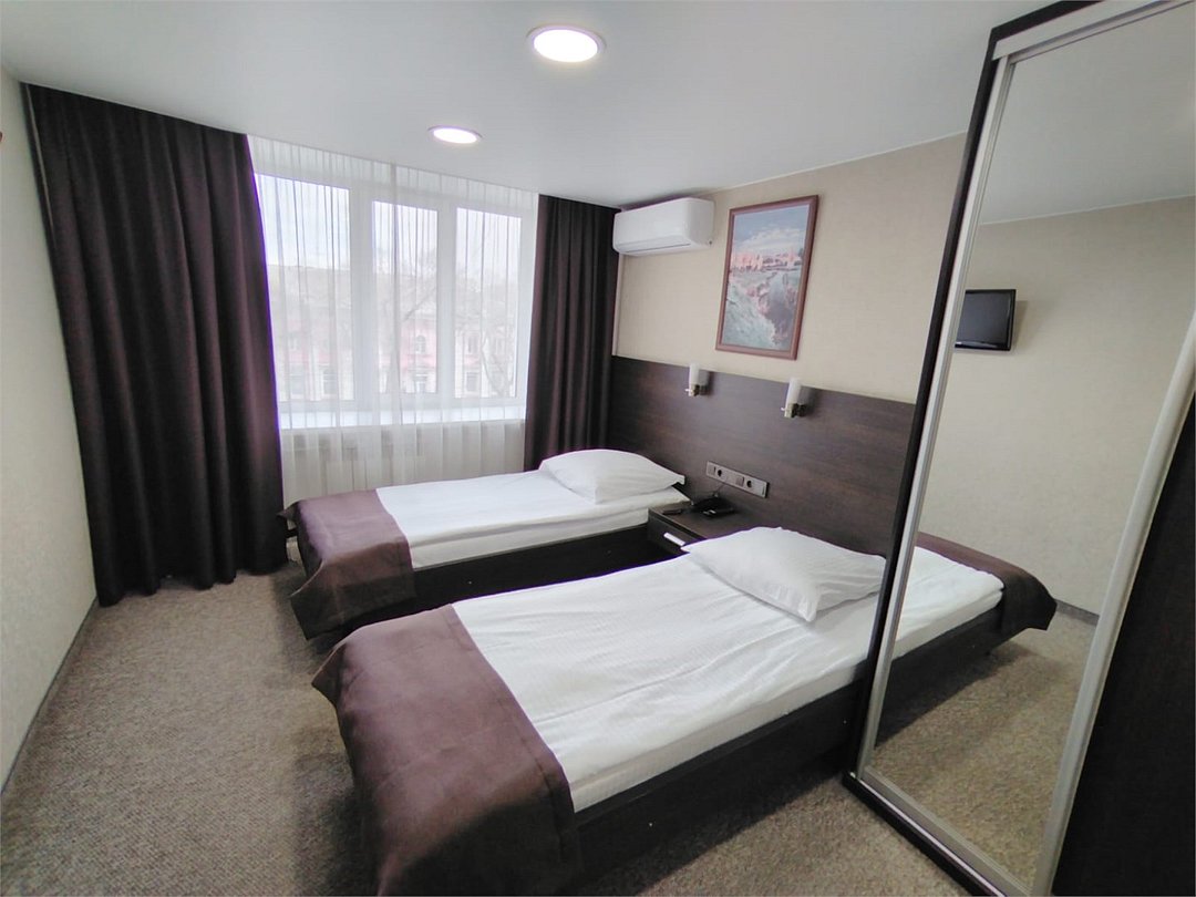 телевизор, кабельное телевидение, Wi-Fi, интернет, телефон, кондиционер, светильник, настольные лампы, фен, обогреватель, ванная комната, банные принадлежности, халаты, банные полотенца, тапочки, гигиенические средства, косметические средства, две односпальные кровати, стулья, шкаф для одежды, вешалки, письменный стол, багажная тумба, зеркало, чайный набор, информационная карта, меню, чайник, унитаз, раковина, питьевая вода, ковровое покрытие, отопление, душ, вид на город, кулер на этаже, вид во двор, меню подушек, стаканы, стул, тумба, туалетные средства, цифровое тв, внутренний телефон, телевизор с плоским экраном, мини-холодильник, москитная сетка, номер для некурящих, рабочий столВ гостиничном номере