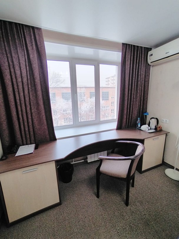 телевизор, кабельное телевидение, Wi-Fi, интернет, телефон, кондиционер, светильник, настольные лампы, фен, обогреватель, ванная комната, банные принадлежности, халаты, банные полотенца, тапочки, гигиенические средства, косметические средства, две односпальные кровати, стулья, шкаф для одежды, вешалки, письменный стол, багажная тумба, зеркало, чайный набор, информационная карта, меню, чайник, унитаз, раковина, питьевая вода, ковровое покрытие, отопление, душ, вид на город, кулер на этаже, вид во двор, меню подушек, стаканы, стул, тумба, туалетные средства, цифровое тв, внутренний телефон, телевизор с плоским экраном, мини-холодильник, москитная сетка, номер для некурящих, рабочий столВ номере