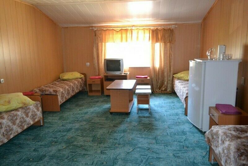1 комната S= 25 кв.м., шкаф-купе для одежды, 3-4 кровати, столик, 4 стула, цветной ТВ, холодильник, электрочайник,удобства на этаже.