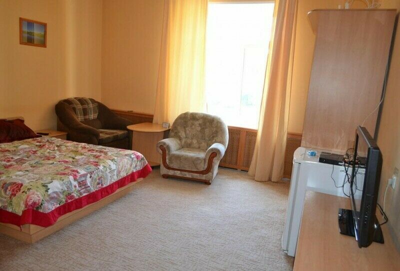 1 комната S=26-30 кв.м, совмещенный санузел (туалет, душ), шкаф-купе трехстворчатый для одежды, спальный гарнитур с большой двуспальной кроватью, кресло-кровать, столик, 2 стула, цветной ТВ, DVD, холодильник, электрочайник, набор посуды, местная АТС.