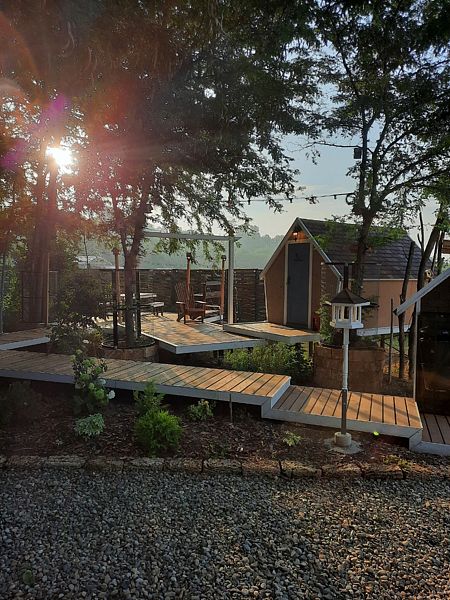Большой гостевой дом находится на отдельном участке, в шаговой доступности от основной территории. Плюс такого размещения в том, что вы можете пользоваться абсолютно всем, что находится на территории глэмпинга, при этом другие гости доступа к территории вашего дома не имеют.