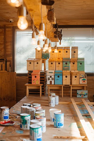 Выдаются одноразовые перчатки, фартук, краски, кисти и весь необходимый инструмент. На каждом мастер-классе вы разукрашиваете два скворечника, один с клеймом глэмпинга забираете домой, а второй вешается на деревья в глэмпинге.